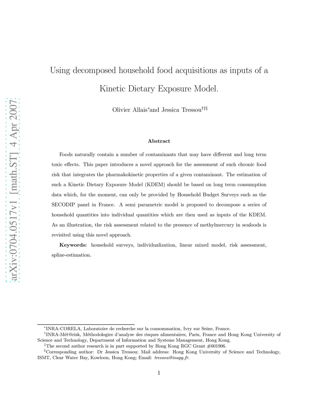 Foods naturally contain a number of contaminants that may have different and long term toxic effects. This paper introduces a novel approach for the assessment of such chronic food risk that integrates the pharmacokinetic properties of a given contaminant. The estimation of such a Kinetic Dietary Exposure Model (KDEM) should be based on long term consumption data which, for the moment, can only be provided by Household Budget Surveys such as the SECODIP panel in France. A semi parametric model is proposed to decompose a series of household quantities into individual quantities which are then used as inputs of the KDEM. As an illustration, the risk assessment related to the presence of methyl mercury in seafood is revisited using this novel approach.