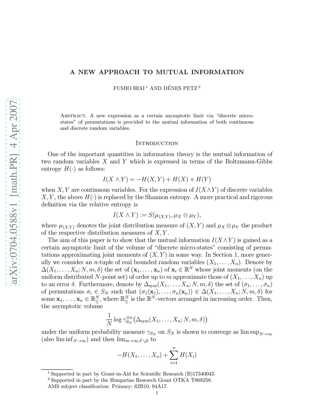 A new expression as a certain asymptotic limit via "discrete micro-states" of permutations is provided to the mutual information of both continuous and discrete random variables.