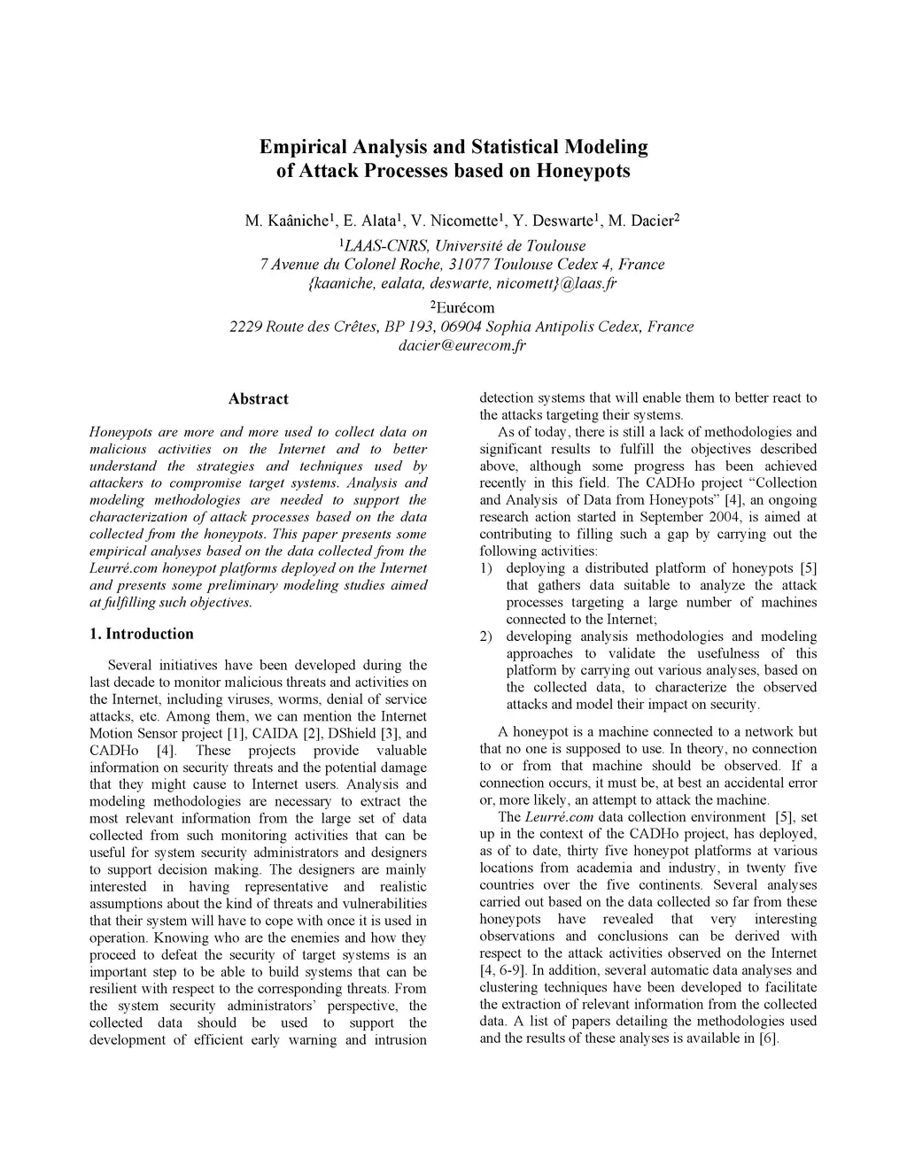 Honeypots are more and more used to collect data on malicious activities on the Internet and to better understand the strategies and techniques used by attackers to compromise target systems. Analysis and modeling methodologies are needed to support the characterization of attack processes based on the data collected from the honeypots. This paper presents some empirical analyses based on the data collected from the Leurr{\é}.com honeypot platforms deployed on the Internet and presents some preliminary modeling studies aimed at fulfilling such objectives.