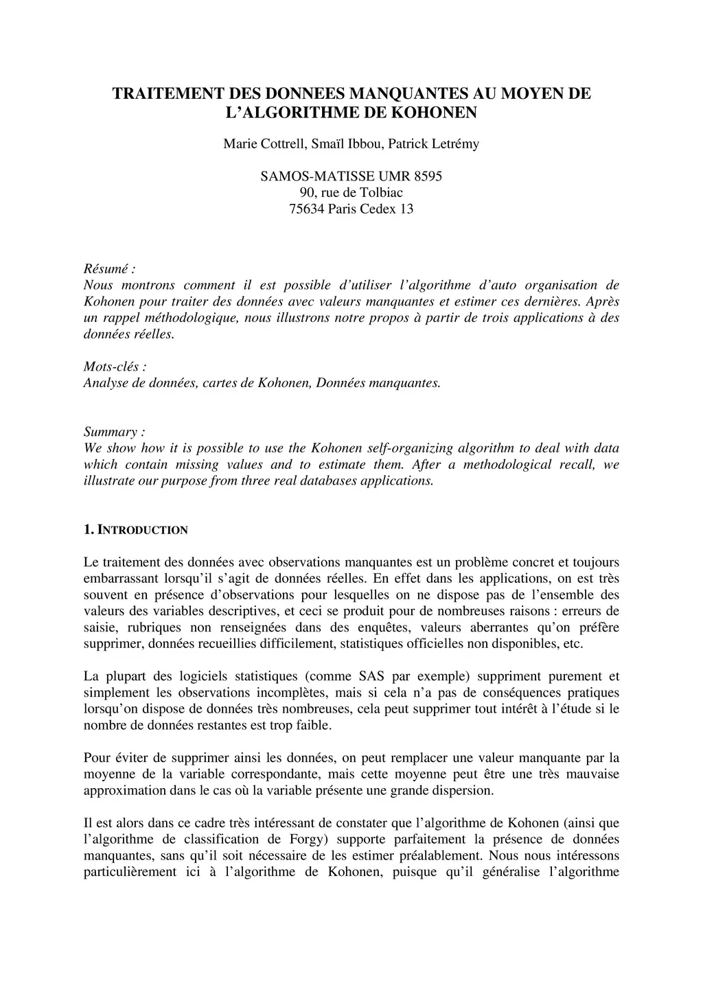 Traitement Des Donnees Manquantes Au Moyen De LÁlgorithme De Kohonen