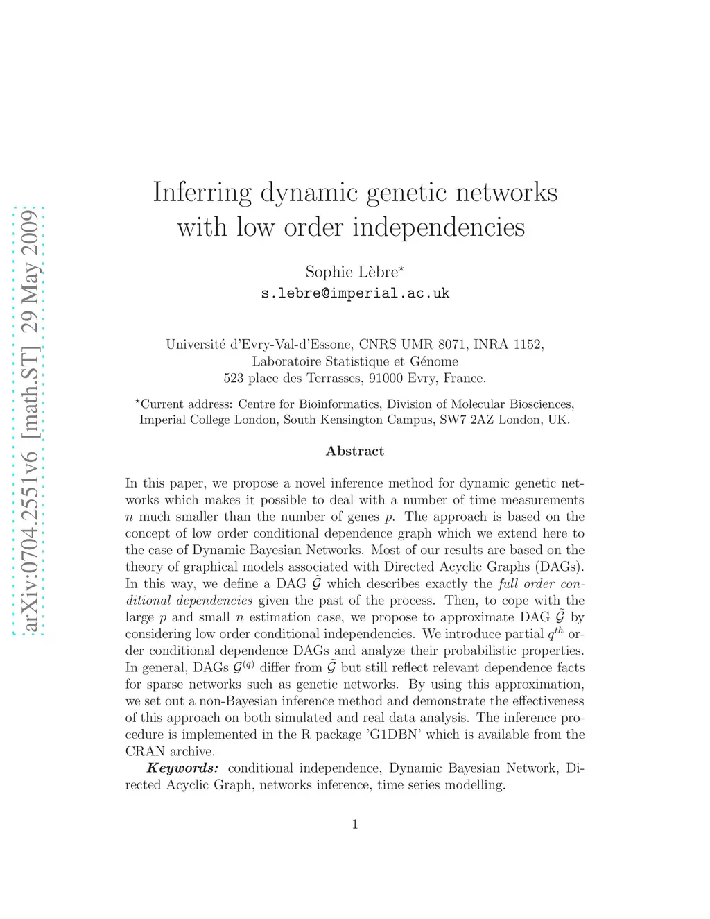 In this paper, we propose a novel inference method for dynamic genetic networks which makes it possible to face with a number of time measurements n much smaller than the number of genes p. The approach is based on the concept of low order conditional dependence graph that we extend here in the case of Dynamic Bayesian Networks. Most of our results are based on the theory of graphical models associated with the Directed Acyclic Graphs (DAGs). In this way, we define a minimal DAG G which describes exactly the full order conditional dependencies given the past of the process. Then, to face with the large p and small n estimation case, we propose to approximate DAG G by considering low order conditional independencies. We introduce partial qth order conditional dependence DAGs G(q) and analyze their probabilistic properties. In general, DAGs G(q) differ from DAG G but still reflect relevant dependence facts for sparse networks such as genetic networks. By using this approximation, we set out a non-bayesian inference method and demonstrate the effectiveness of this approach on both simulated and real data analysis. The inference procedure is implemented in the R package 'G1DBN' freely available from the CRAN archive.