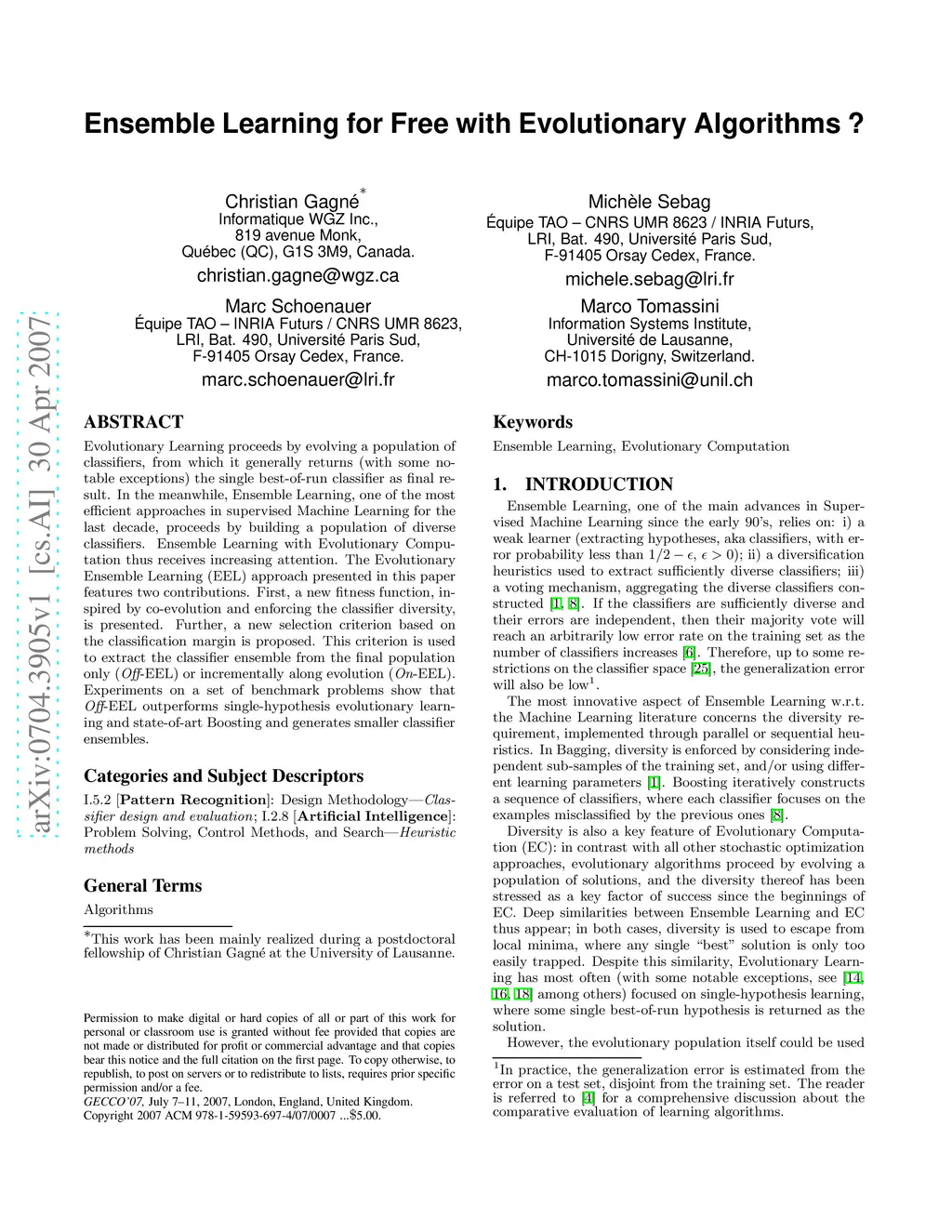 Evolutionary Learning proceeds by evolving a population of classifiers, from which it generally returns (with some notable exceptions) the single best-of-run classifier as final result. In the meanwhile, Ensemble Learning, one of the most efficient approaches in supervised Machine Learning for the last decade, proceeds by building a population of diverse classifiers. Ensemble Learning with Evolutionary Computation thus receives increasing attention. The Evolutionary Ensemble Learning (EEL) approach presented in this paper features two contributions. First, a new fitness function, inspired by co-evolution and enforcing the classifier diversity, is presented. Further, a new selection criterion based on the classification margin is proposed. This criterion is used to extract the classifier ensemble from the final population only (Off-line) or incrementally along evolution (On-line). Experiments on a set of benchmark problems show that Off-line outperforms single-hypothesis evolutionary learning and state-of-art Boosting and generates smaller classifier ensembles.