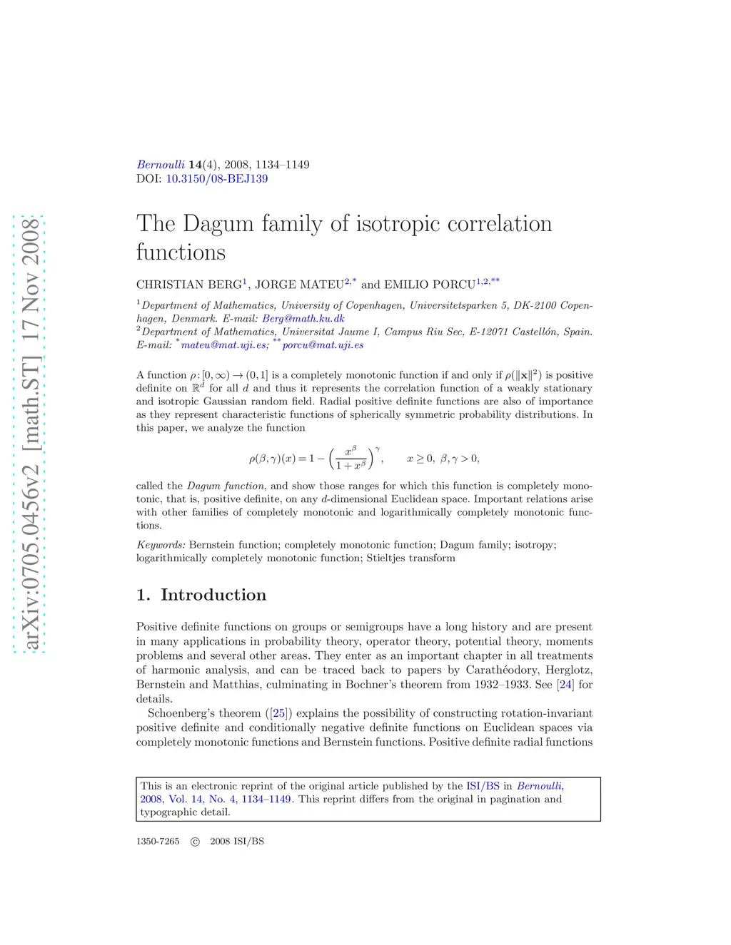 A function is a completely monotonic function if and only if is positive definite on for all and thus it represents the correlation function of a weakly stationary and isotropic Gaussian random field. Radial positive definite functions are also of importance as they represent characteristic functions of spherically symmetric probability distributions. In this paper, we analyze the function \[\rho(\beta ,\gamma)(x)=1-\biggl(\frac{x^{\beta}}{1+x^{\beta}}\biggr )^{\gamma},\qquad x\ge 0, \beta,\gamma>0,\] called the Dagum function, and show those ranges for which this function is completely monotonic, that is, positive definite, on any -dimensional Euclidean space. Important relations arise with other families of completely monotonic and logarithmically completely monotonic functions.