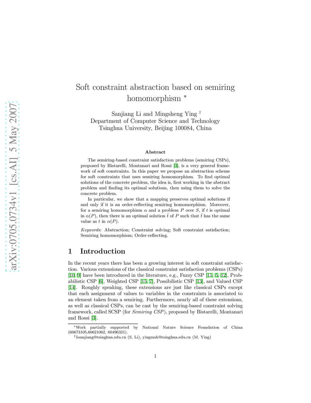 The semiring-based constraint satisfaction problems (semiring CSPs), proposed by Bistarelli, Montanari and Rossi \cite{BMR97}, is a very general framework of soft constraints. In this paper we propose an abstraction scheme for soft constraints that uses semiring homomorphism. To find optimal solutions of the concrete problem, the idea is, first working in the abstract problem and finding its optimal solutions, then using them to solve the concrete problem. In particular, we show that a mapping preserves optimal solutions if and only if it is an order-reflecting semiring homomorphism. Moreover, for a semiring homomorphism and a problem over , if is optimal in , then there is an optimal solution of such that has the same value as in .