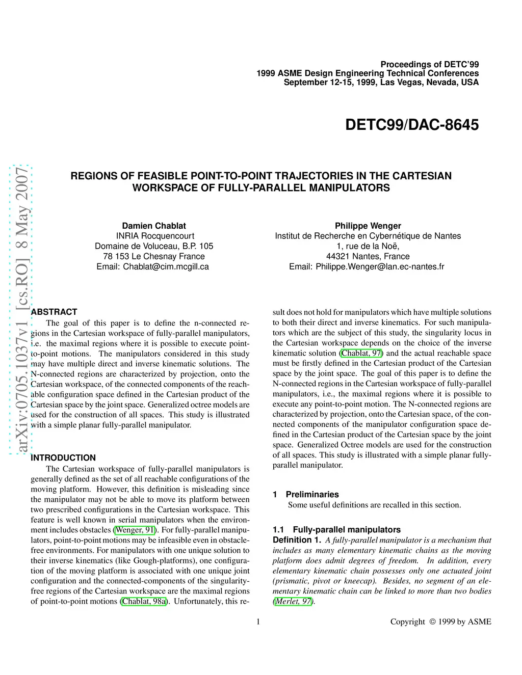 The goal of this paper is to define the n-connected regions in the Cartesian workspace of fully-parallel manipulators, i.e. the maximal regions where it is possible to execute point-to-point motions. The manipulators considered in this study may have multiple direct and inverse kinematic solutions. The N-connected regions are characterized by projection, onto the Cartesian workspace, of the connected components of the reachable configuration space defined in the Cartesian product of the Cartesian space by the joint space. Generalized octree models are used for the construction of all spaces. This study is illustrated with a simple planar fully-parallel manipulator.
