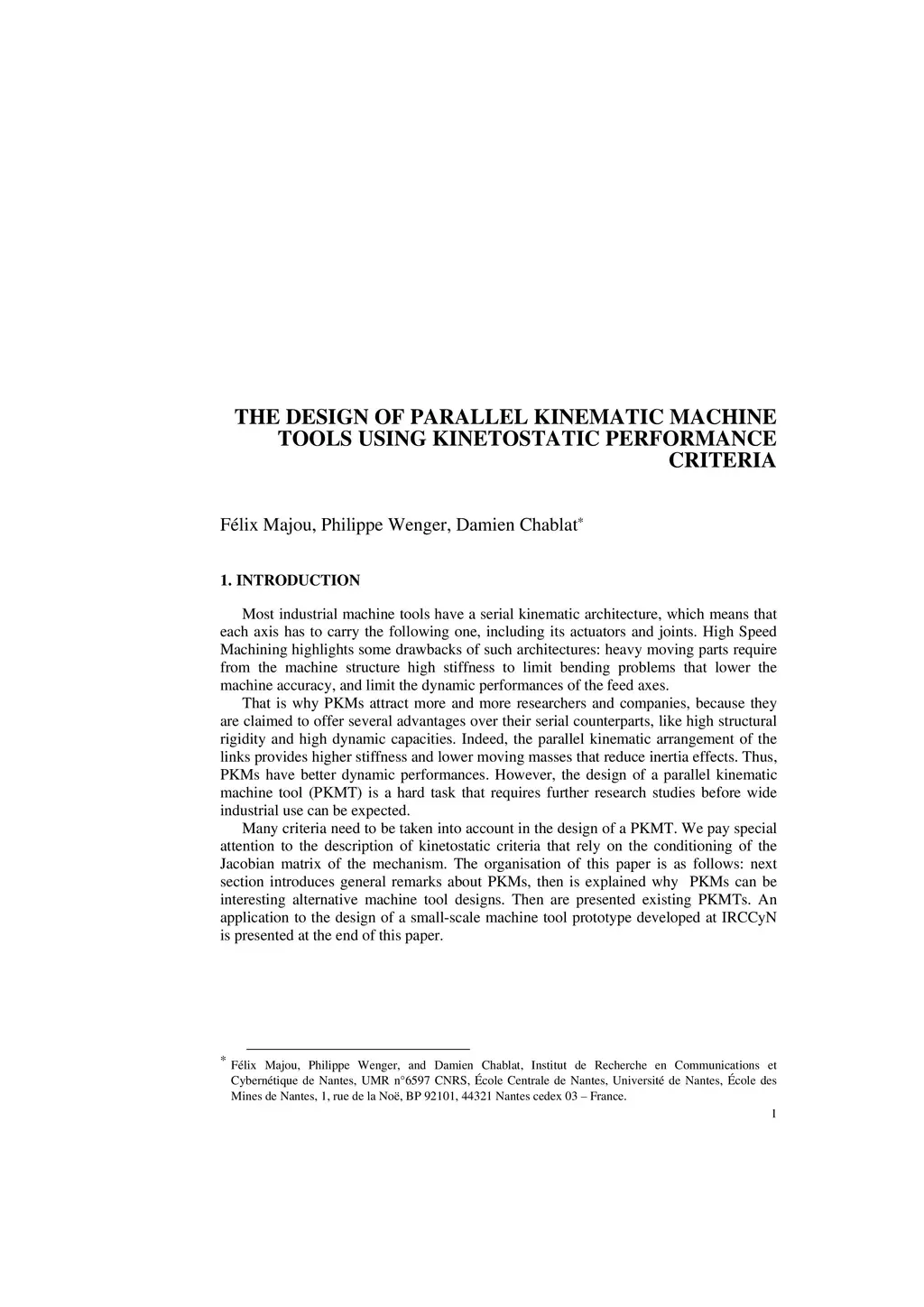 Most industrial machine tools have a serial kinematic architecture, which means that each axis has to carry the following one, including its actuators and joints. High Speed Machining highlights some drawbacks of such architectures: heavy moving parts require from the machine structure high stiffness to limit bending problems that lower the machine accuracy, and limit the dynamic performances of the feed axes. That is why PKMs attract more and more researchers and companies, because they are claimed to offer several advantages over their serial counterparts, like high structural rigidity and high dynamic capacities. Indeed, the parallel kinematic arrangement of the links provides higher stiffness and lower moving masses that reduce inertia effects. Thus, PKMs have better dynamic performances. However, the design of a parallel kinematic machine tool (PKMT) is a hard task that requires further research studies before wide industrial use can be expected. Many criteria need to be taken into account in the design of a PKMT. We pay special attention to the description of kinetostatic criteria that rely on the conditioning of the Jacobian matrix of the mechanism. The organisation of this paper is as follows: next section introduces general remarks about PKMs, then is explained why PKMs can be interesting alternative machine tool designs. Then are presented existing PKMTs. An application to the design of a small-scale machine tool prototype developed at IRCCyN is presented at the end of this paper.