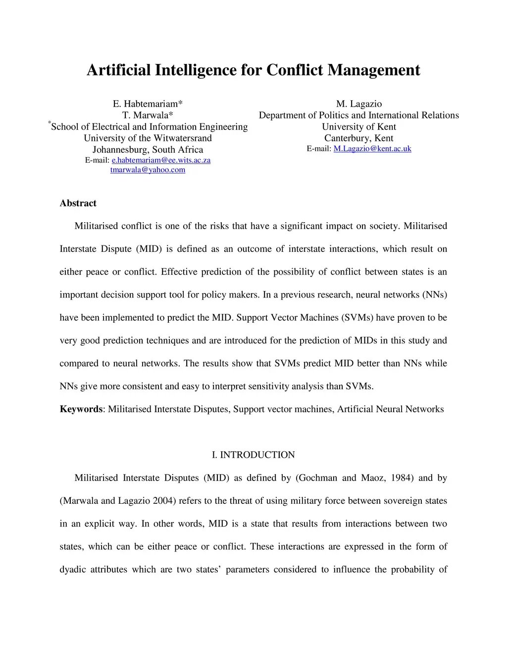 Militarised conflict is one of the risks that have a significant impact on society. Militarised Interstate Dispute (MID) is defined as an outcome of interstate interactions, which result on either peace or conflict. Effective prediction of the possibility of conflict between states is an important decision support tool for policy makers. In a previous research, neural networks (NNs) have been implemented to predict the MID. Support Vector Machines (SVMs) have proven to be very good prediction techniques and are introduced for the prediction of MIDs in this study and compared to neural networks. The results show that SVMs predict MID better than NNs while NNs give more consistent and easy to interpret sensitivity analysis than SVMs.