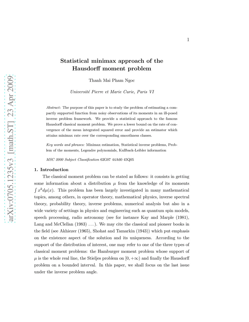 The purpose of this paper is to study the problem of estimating a compactly supported density of probability from noisy observations of its moments. In fact, we provide a statistical approach to the famous Hausdorff classical moment problem. We prove an upper bound and a lower bound on the rate of convergence of the mean squared error showing that the considered estimator attains minimax rate over the corresponding smoothness classes.