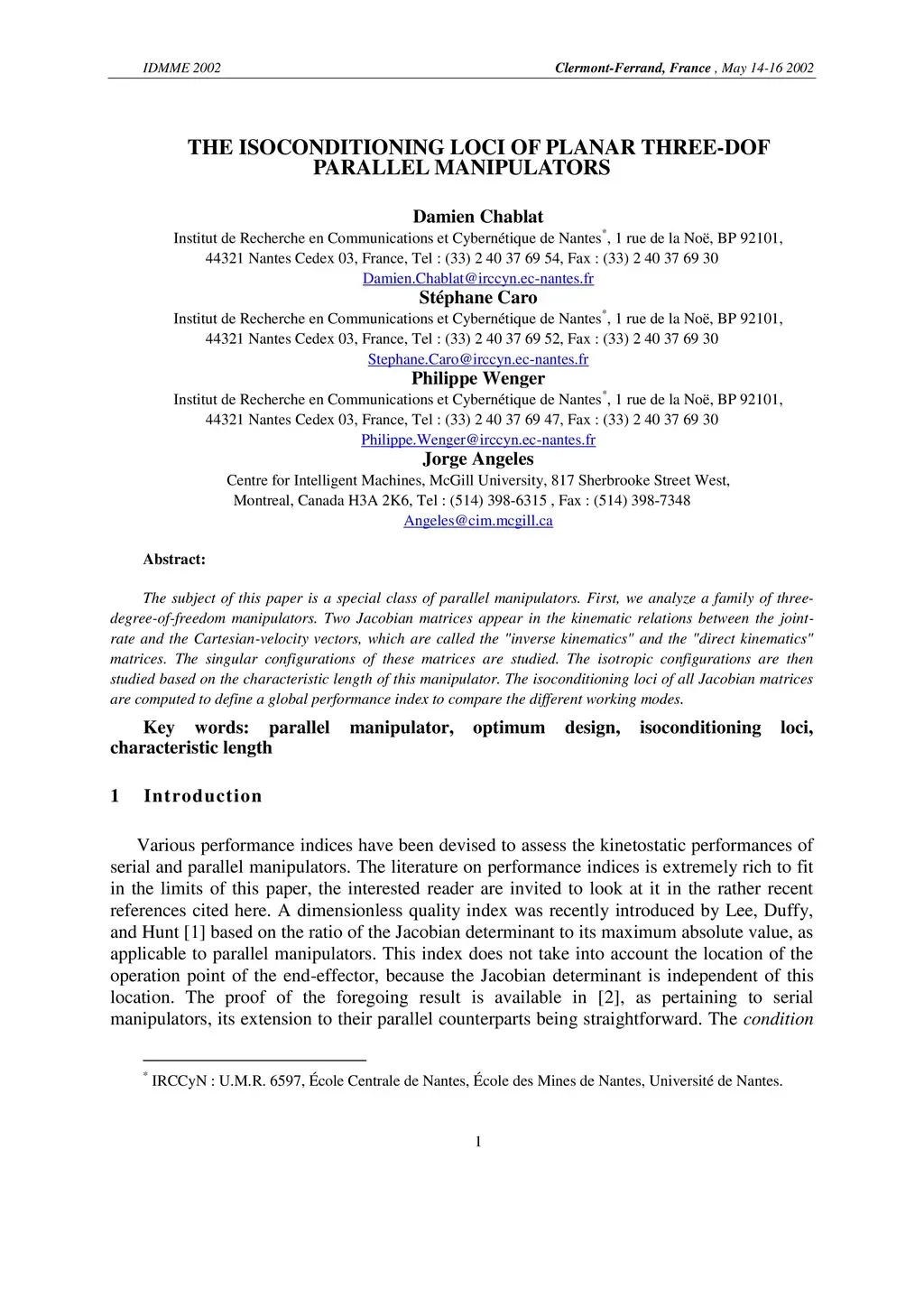The subject of this paper is a special class of parallel manipulators. First, we analyze a family of three-degree-of-freedom manipulators. Two Jacobian matrices appear in the kinematic relations between the joint-rate and the Cartesian-velocity vectors, which are called the "inverse kinematics" and the "direct kinematics" matrices. The singular configurations of these matrices are studied. The isotropic configurations are then studied based on the characteristic length of this manipulator. The isoconditioning loci of all Jacobian matrices are computed to define a global performance index to compare the different working modes.