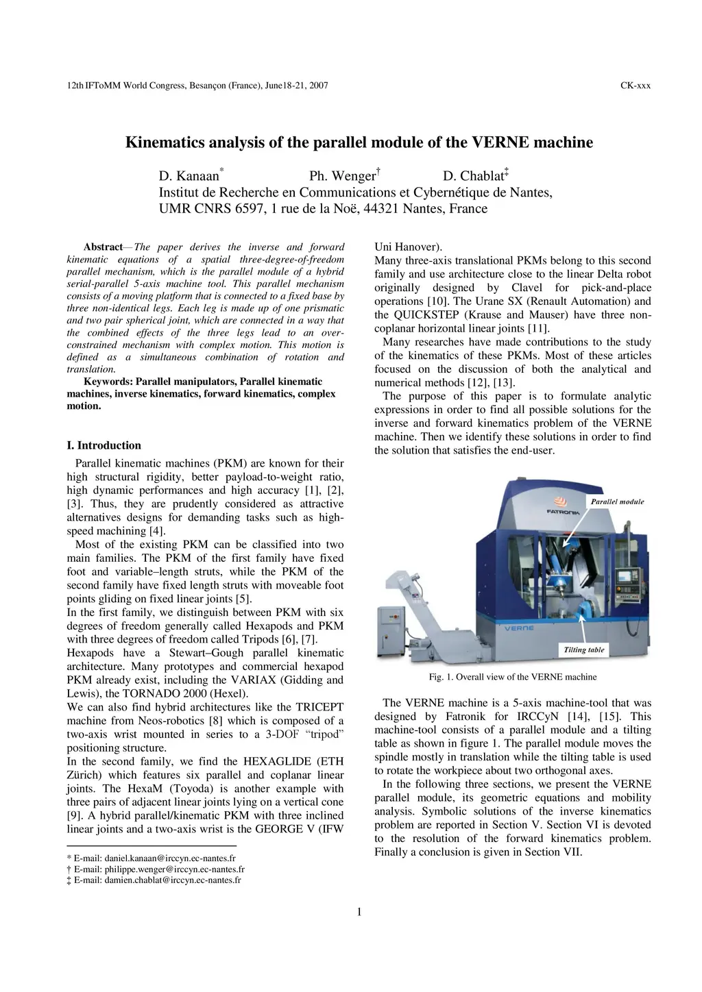 The paper derives the inverse and forward kinematic equations of a spatial three-degree-of-freedom parallel mechanism, which is the parallel module of a hybrid serial-parallel 5-axis machine tool. This parallel mechanism consists of a moving platform that is connected to a fixed base by three non-identical legs. Each leg is made up of one prismatic and two pair spherical joint, which are connected in a way that the combined effects of the three legs lead to an over-constrained mechanism with complex motion. This motion is defined as a simultaneous combination of rotation and translation.