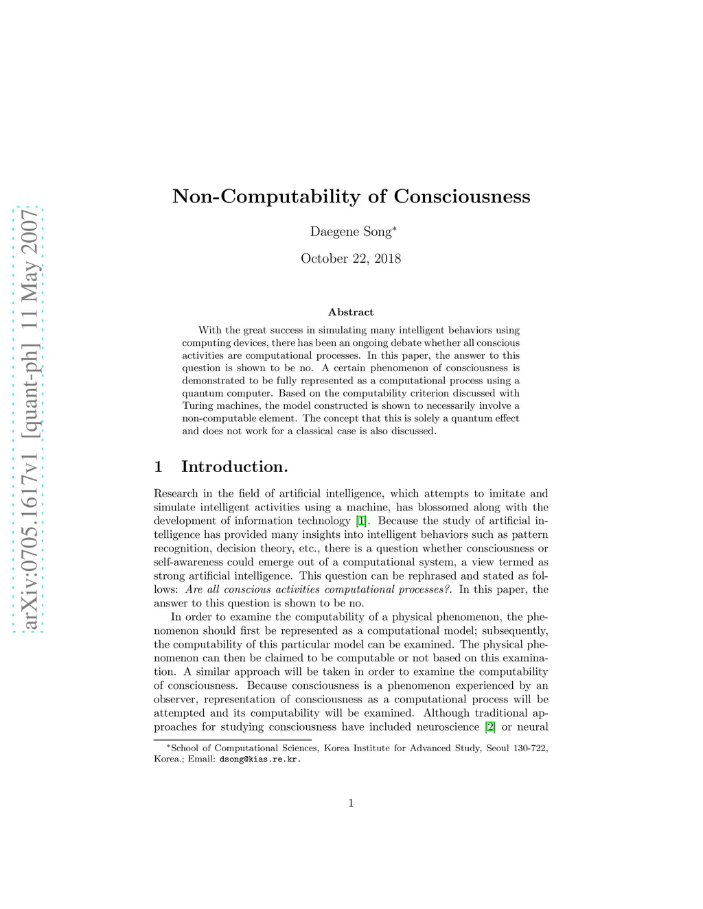 With the great success in simulating many intelligent behaviors using computing devices, there has been an ongoing debate whether all conscious activities are computational processes. In this paper, the answer to this question is shown to be no. A certain phenomenon of consciousness is demonstrated to be fully represented as a computational process using a quantum computer. Based on the computability criterion discussed with Turing machines, the model constructed is shown to necessarily involve a non-computable element. The concept that this is solely a quantum effect and does not work for a classical case is also discussed.