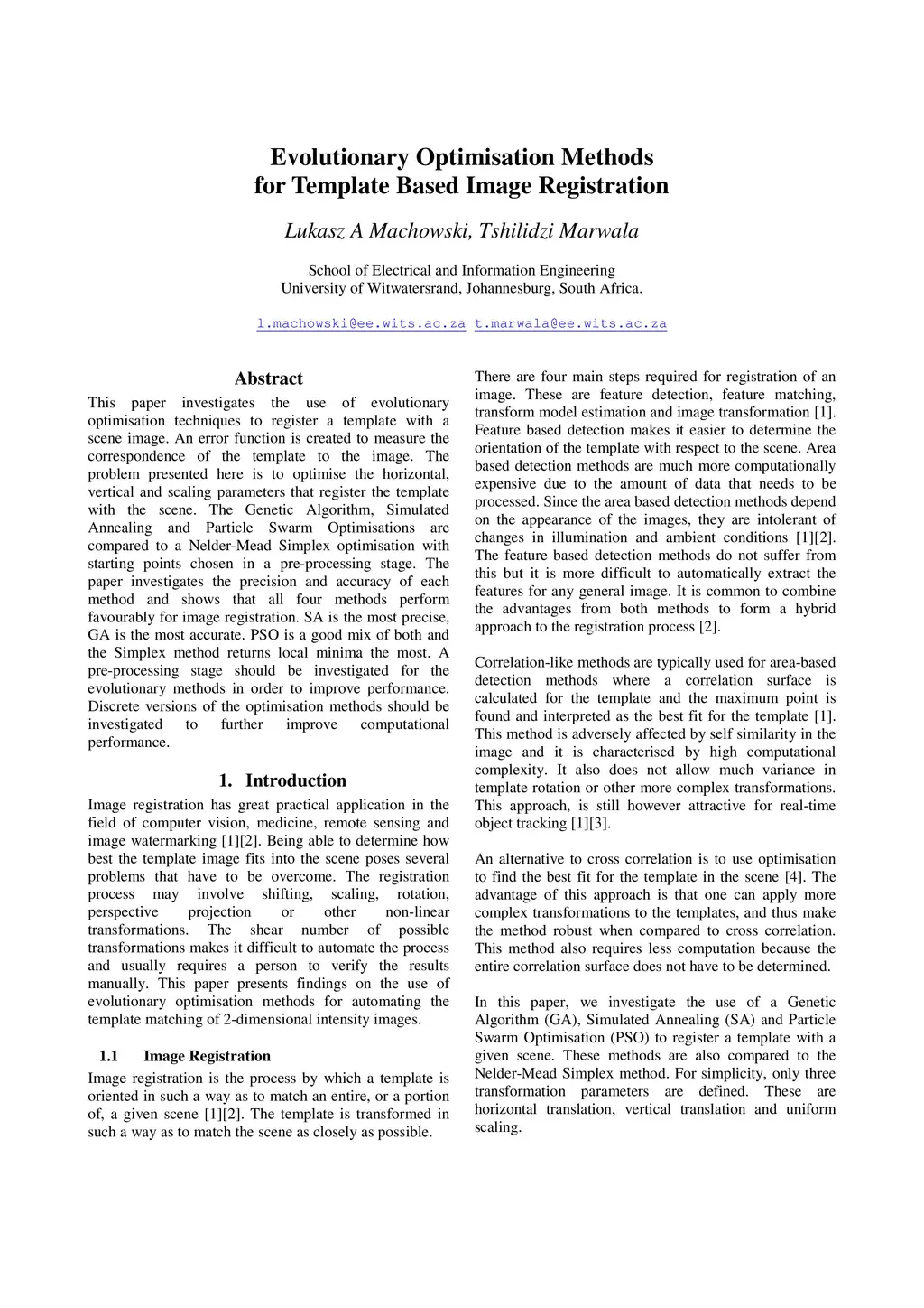 This paper investigates the use of evolutionary optimisation techniques to register a template with a scene image. An error function is created to measure the correspondence of the template to the image. The problem presented here is to optimise the horizontal, vertical and scaling parameters that register the template with the scene. The Genetic Algorithm, Simulated Annealing and Particle Swarm Optimisations are compared to a Nelder-Mead Simplex optimisation with starting points chosen in a pre-processing stage. The paper investigates the precision and accuracy of each method and shows that all four methods perform favourably for image registration. SA is the most precise, GA is the most accurate. PSO is a good mix of both and the Simplex method returns local minima the most. A pre-processing stage should be investigated for the evolutionary methods in order to improve performance. Discrete versions of the optimisation methods should be investigated to further improve computational performance.