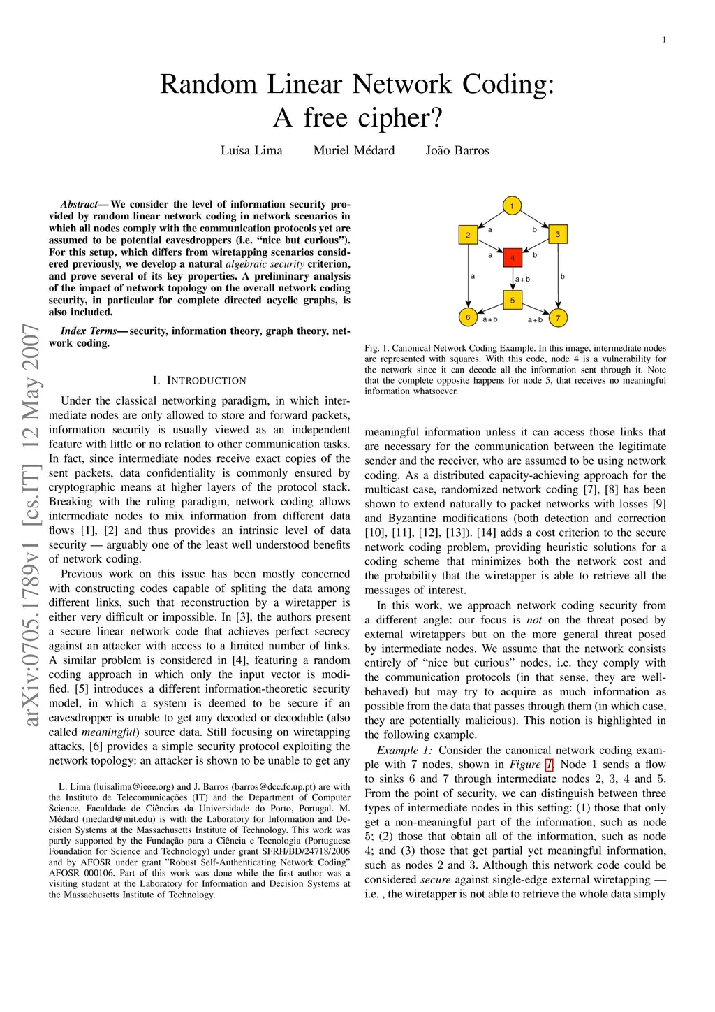 We consider the level of information security provided by random linear network coding in network scenarios in which all nodes comply with the communication protocols yet are assumed to be potential eavesdroppers (i.e. "nice but curious"). For this setup, which differs from wiretapping scenarios considered previously, we develop a natural algebraic security criterion, and prove several of its key properties. A preliminary analysis of the impact of network topology on the overall network coding security, in particular for complete directed acyclic graphs, is also included.
