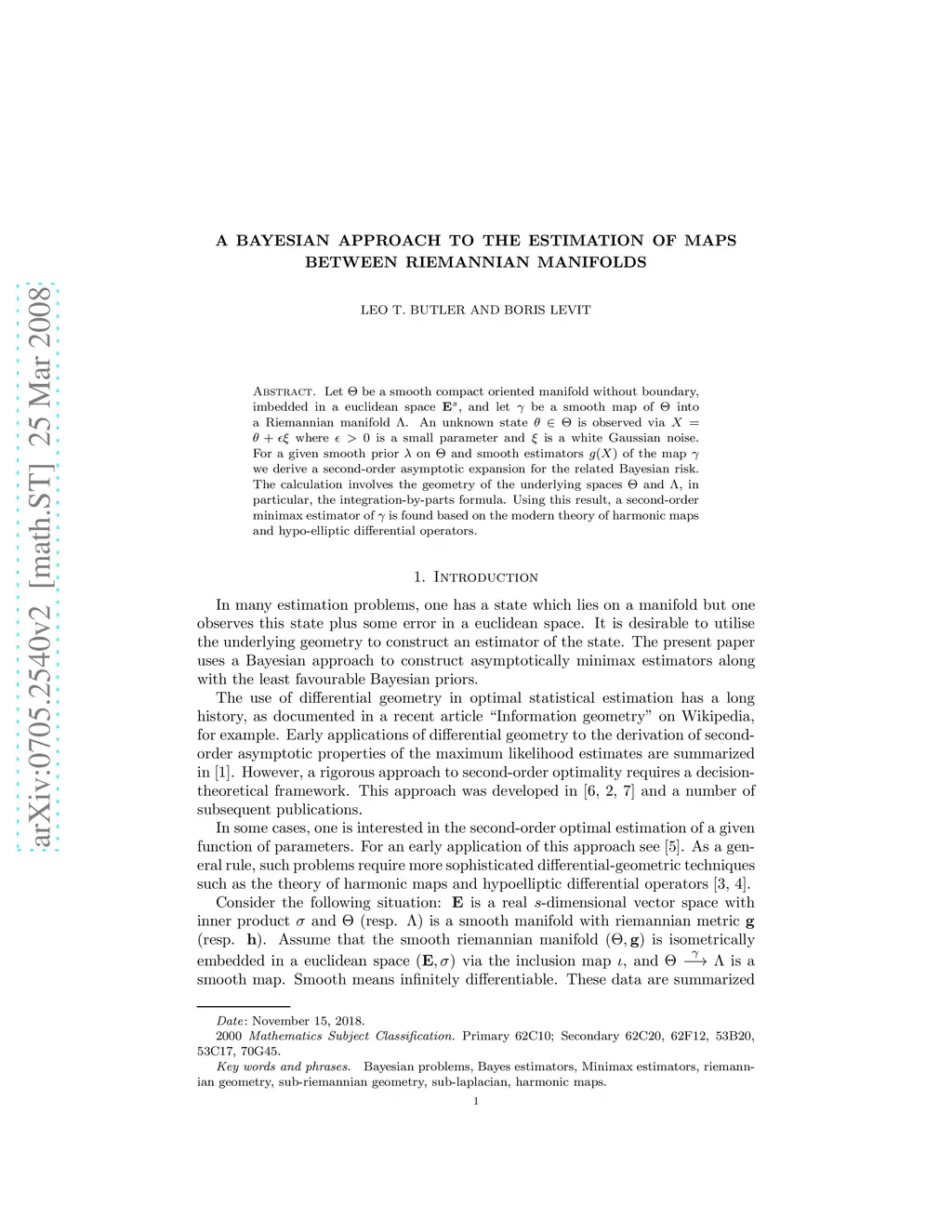 Let \Theta be a smooth compact oriented manifold without boundary, embedded in a euclidean space and let \gamma be a smooth map \Theta into a riemannian manifold \Lambda. An unknown state \theta \in \Theta is observed via X=\theta+\epsilon \xi where \epsilon>0 is a small parameter and \xi is a white Gaussian noise. For a given smooth prior on \Theta and smooth estimator g of the map \gamma we derive a second-order asymptotic expansion for the related Bayesian risk. The calculation involves the geometry of the underlying spaces \Theta and \Lambda, in particular, the integration-by-parts formula. Using this result, a second-order minimax estimator of \gamma is found based on the modern theory of harmonic maps and hypo-elliptic differential operators.