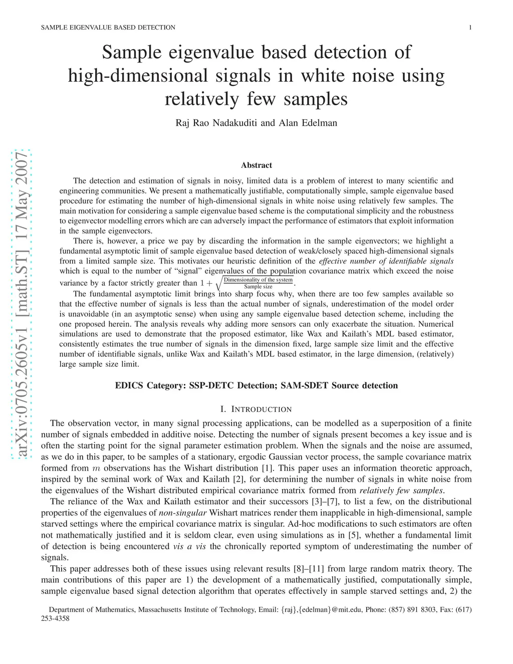 We present a mathematically justifiable, computationally simple, sample eigenvalue based procedure for estimating the number of high-dimensional signals in white noise using relatively few samples. The main motivation for considering a sample eigenvalue based scheme is the computational simplicity and the robustness to eigenvector modelling errors which are can adversely impact the performance of estimators that exploit information in the sample eigenvectors. There is, however, a price we pay by discarding the information in the sample eigenvectors; we highlight a fundamental asymptotic limit of sample eigenvalue based detection of weak/closely spaced high-dimensional signals from a limited sample size. This motivates our heuristic definition of the effective number of identifiable signals which is equal to the number of "signal" eigenvalues of the population covariance matrix which exceed the noise variance by a factor strictly greater than 1+sqrt(Dimensionality of the system/Sample size). The fundamental asymptotic limit brings into sharp focus why, when there are too few samples available so that the effective number of signals is less than the actual number of signals, underestimation of the model order is unavoidable (in an asymptotic sense) when using any sample eigenvalue based detection scheme, including the one proposed herein. The analysis reveals why adding more sensors can only exacerbate the situation. Numerical simulations are used to demonstrate that the proposed estimator consistently estimates the true number of signals in the dimension fixed, large sample size limit and the effective number of identifiable signals in the large dimension, large sample size limit.
