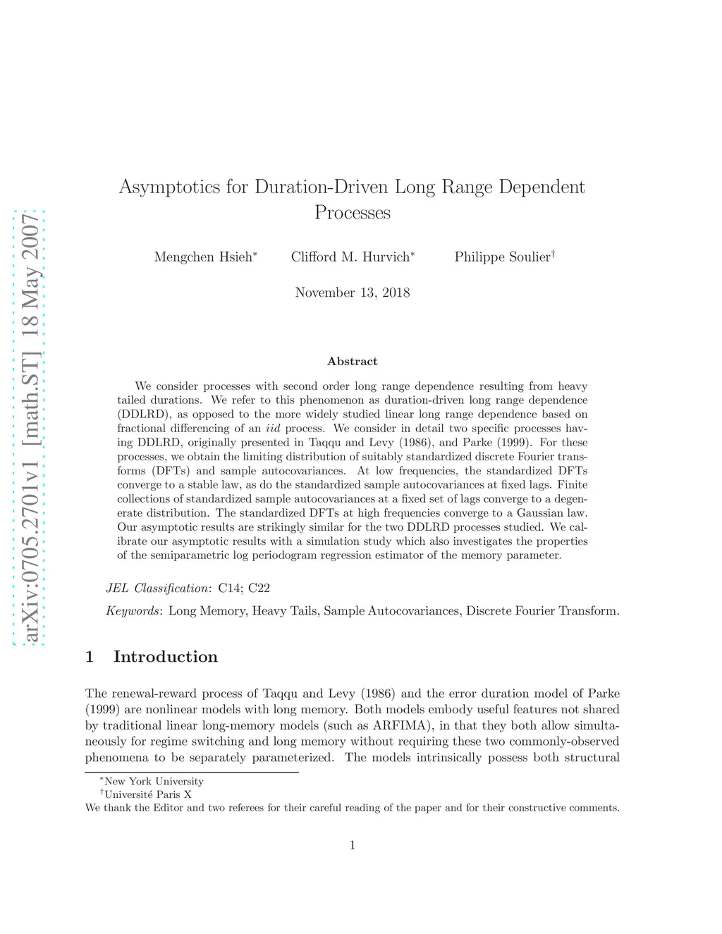 We consider processes with second order long range dependence resulting from heavy tailed durations. We refer to this phenomenon as duration-driven long range dependence (DDLRD), as opposed to the more widely studied linear long range dependence based on fractional differencing of an process. We consider in detail two specific processes having DDLRD, originally presented in Taqqu and Levy (1986), and Parke (1999). For these processes, we obtain the limiting distribution of suitably standardized discrete Fourier transforms (DFTs) and sample autocovariances. At low frequencies, the standardized DFTs converge to a stable law, as do the standardized sample autocovariances at fixed lags. Finite collections of standardized sample autocovariances at a fixed set of lags converge to a degenerate distribution. The standardized DFTs at high frequencies converge to a Gaussian law. Our asymptotic results are strikingly similar for the two DDLRD processes studied. We calibrate our asymptotic results with a simulation study which also investigates the properties of the semiparametric log periodogram regression estimator of the memory parameter.