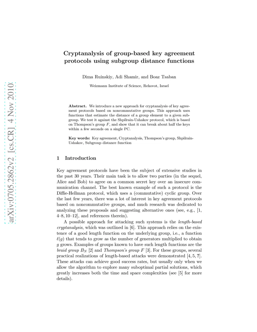 We introduce a new approach for cryptanalysis of key agreement protocols based on noncommutative groups. This approach uses functions that estimate the distance of a group element to a given subgroup. We test it against the Shpilrain-Ushakov protocol, which is based on Thompson's group F.
