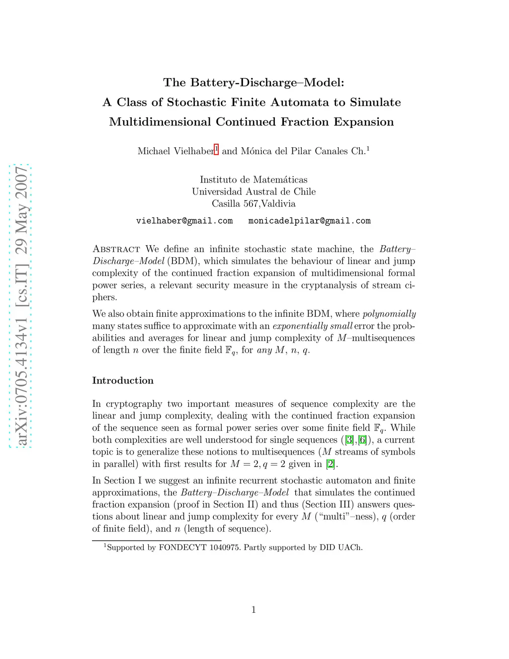 We define an infinite stochastic state machine, the Battery-Discharge-Model (BDM), which simulates the behaviour of linear and jump complexity of the continued fraction expansion of multidimensional formal power series, a relevant security measure in the cryptanalysis of stream ciphers. We also obtain finite approximations to the infinite BDM, where polynomially many states suffice to approximate with an exponentially small error the probabilities and averages for linear and jump complexity of M-multisequences of length n over the finite field F_q, for any M, n, q.