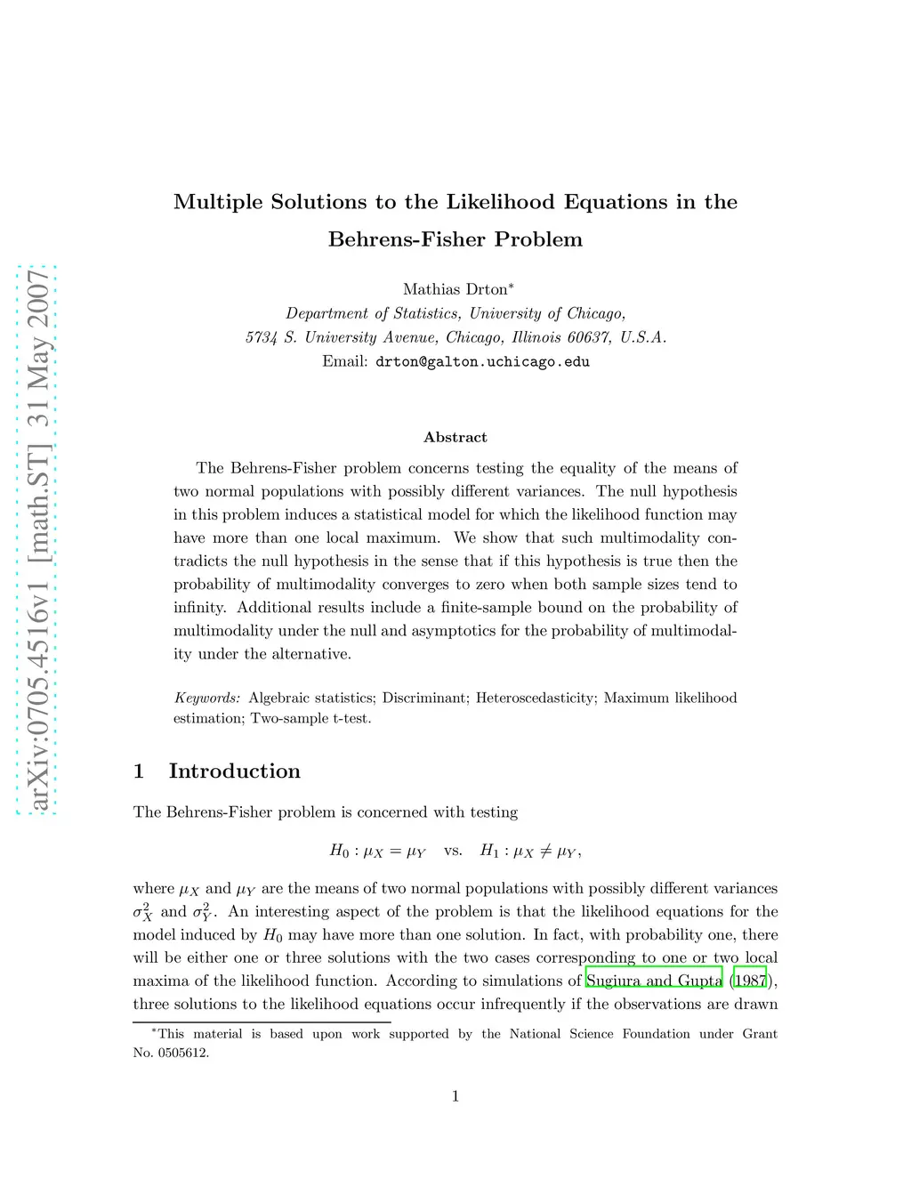 The Behrens-Fisher problem concerns testing the equality of the means of two normal populations with possibly different variances. The null hypothesis in this problem induces a statistical model for which the likelihood function may have more than one local maximum. We show that such multimodality contradicts the null hypothesis in the sense that if this hypothesis is true then the probability of multimodality converges to zero when both sample sizes tend to infinity. Additional results include a finite-sample bound on the probability of multimodality under the null and asymptotics for the probability of multimodality under the alternative.