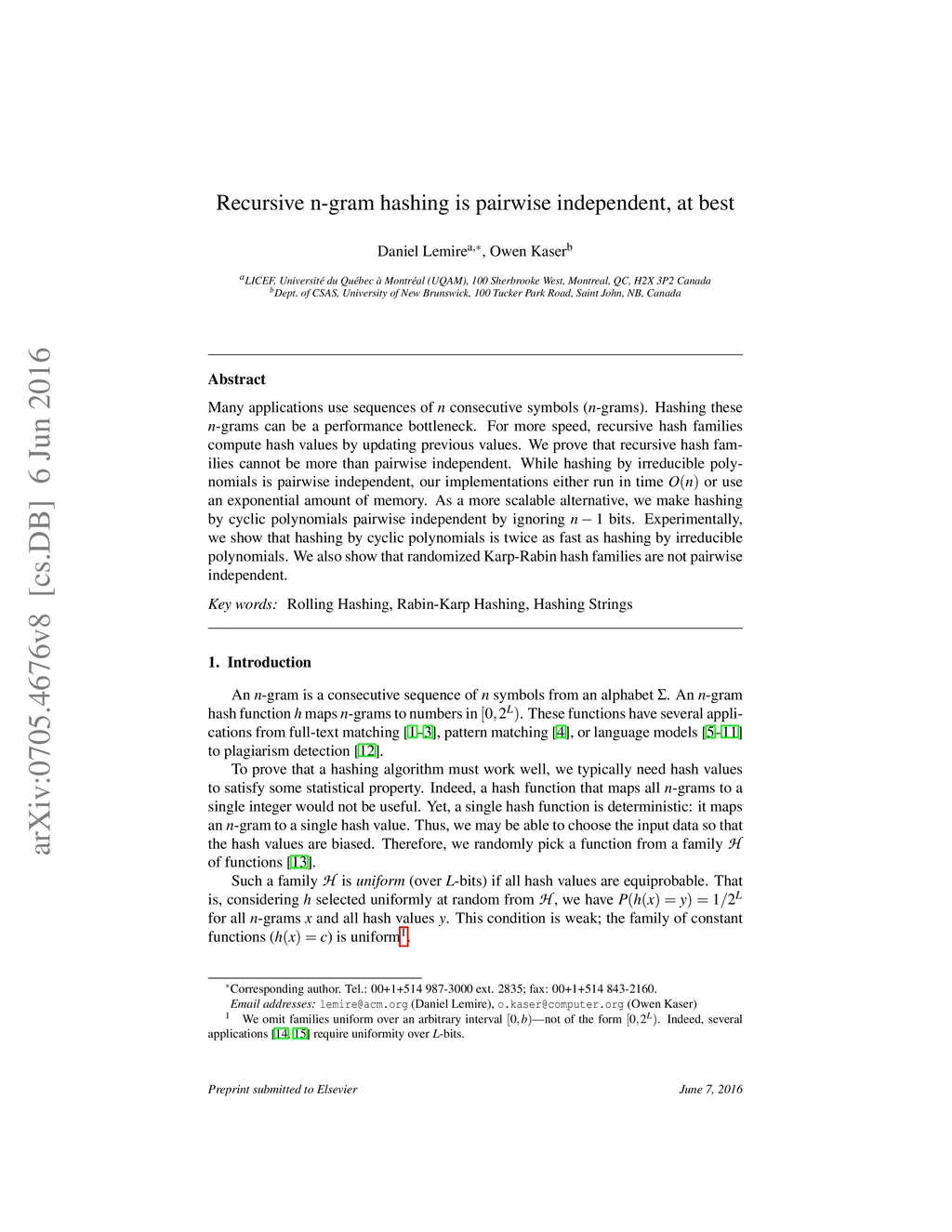 Many applications use sequences of n consecutive symbols (n-grams). Hashing these n-grams can be a performance bottleneck. For more speed, recursive hash families compute hash values by updating previous values. We prove that recursive hash families cannot be more than pairwise independent. While hashing by irreducible polynomials is pairwise independent, our implementations either run in time O(n) or use an exponential amount of memory. As a more scalable alternative, we make hashing by cyclic polynomials pairwise independent by ignoring n-1 bits. Experimentally, we show that hashing by cyclic polynomials is is twice as fast as hashing by irreducible polynomials. We also show that randomized Karp-Rabin hash families are not pairwise independent.