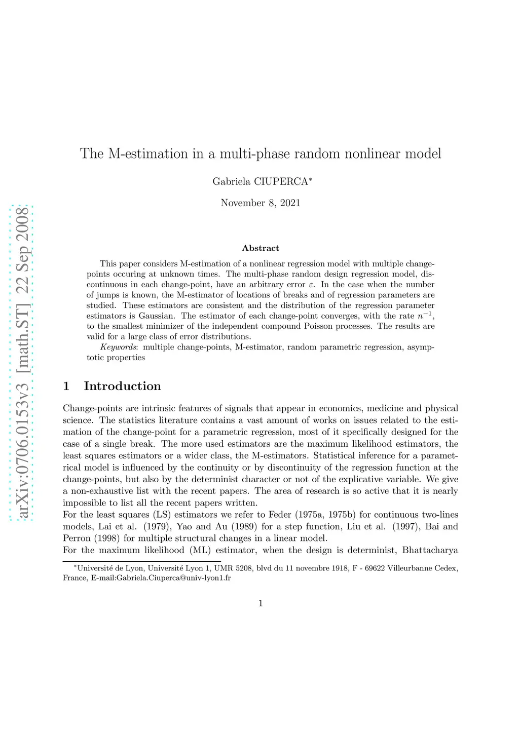 This paper considers M-estimation of a nonlinear regression model with multiple change-points occuring at unknown times. The multi-phase random design regression model, discontinuous in each change-point, have an arbitrary error . In the case when the number of jumps is known, the M-estimator of locations of breaks and of regression parameters are studied. These estimators are consistent and the distribution of the regression parameter estimators is Gaussian. The estimator of each change-point converges, with the rate , to the smallest minimizer of the independent compound Poisson processes. The results are valid for a large class of error distributions.