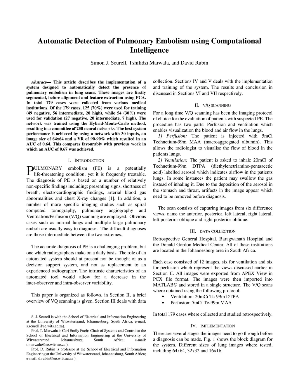This article describes the implementation of a system designed to automatically detect the presence of pulmonary embolism in lung scans. These images are firstly segmented, before alignment and feature extraction using PCA. The neural network was trained using the Hybrid Monte Carlo method, resulting in a committee of 250 neural networks and good results are obtained.