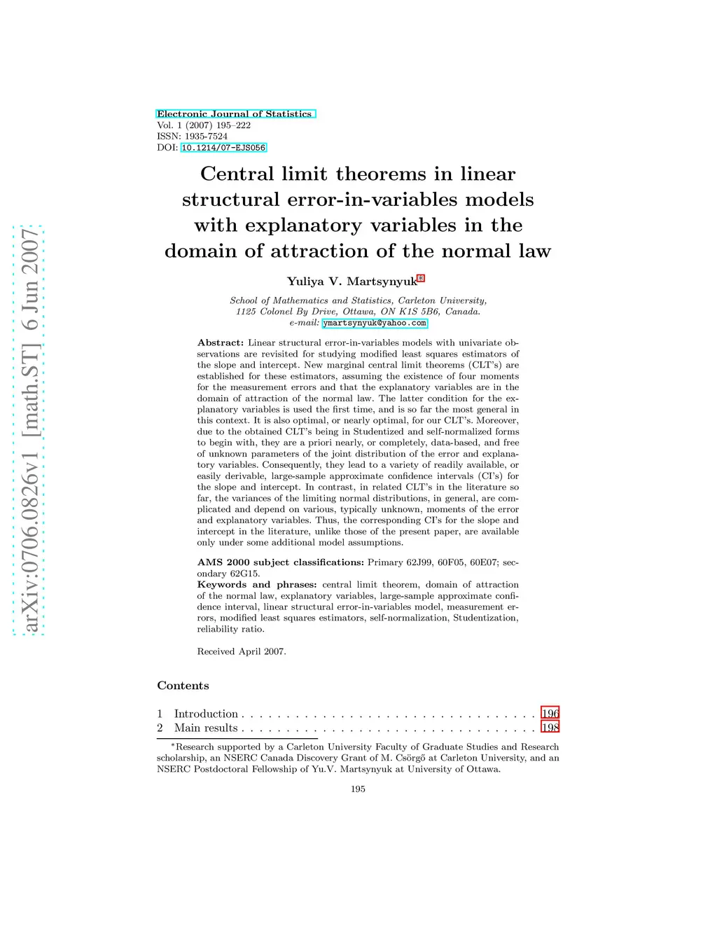 Linear structural error-in-variables models with univariate observations are revisited for studying modified least squares estimators of the slope and intercept. New marginal central limit theorems (CLT's) are established for these estimators, assuming the existence of four moments for the measurement errors and that the explanatory variables are in the domain of attraction of the normal law. The latter condition for the explanatory variables is used the first time, and is so far the most general in this context. It is also optimal, or nearly optimal, for our CLT's. Moreover, due to the obtained CLT's being in Studentized and self-normalized forms to begin with, they are a priori nearly, or completely, data-based, and free of unknown parameters of the joint distribution of the error and explanatory variables. Consequently, they lead to a variety of readily available, or easily derivable, large-sample approximate confidence intervals (CI's) for the slope and intercept. In contrast, in related CLT's in the literature so far, the variances of the limiting normal distributions, in general, are complicated and depend on various, typically unknown, moments of the error and explanatory variables. Thus, the corresponding CI's for the slope and intercept in the literature, unlike those of the present paper, are available only under some additional model assumptions.