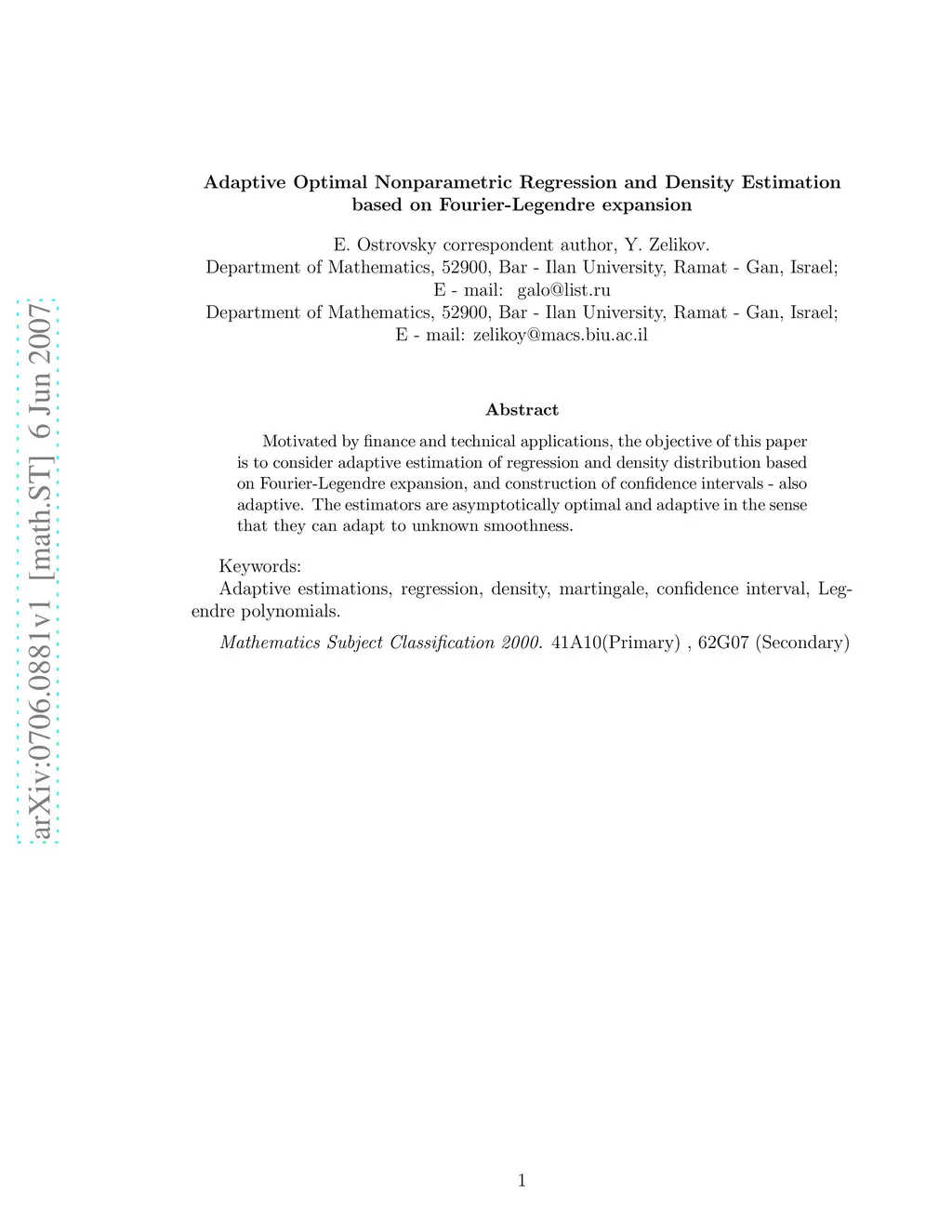 Motivated by finance and technical applications, the objective of this paper is to consider adaptive estimation of regression and density distribution based on Fourier-Legendre expansion, and construction of confidence intervals - also adaptive. The estimators are asymptotically optimal and adaptive in the sense that they can adapt to unknown smoothness.