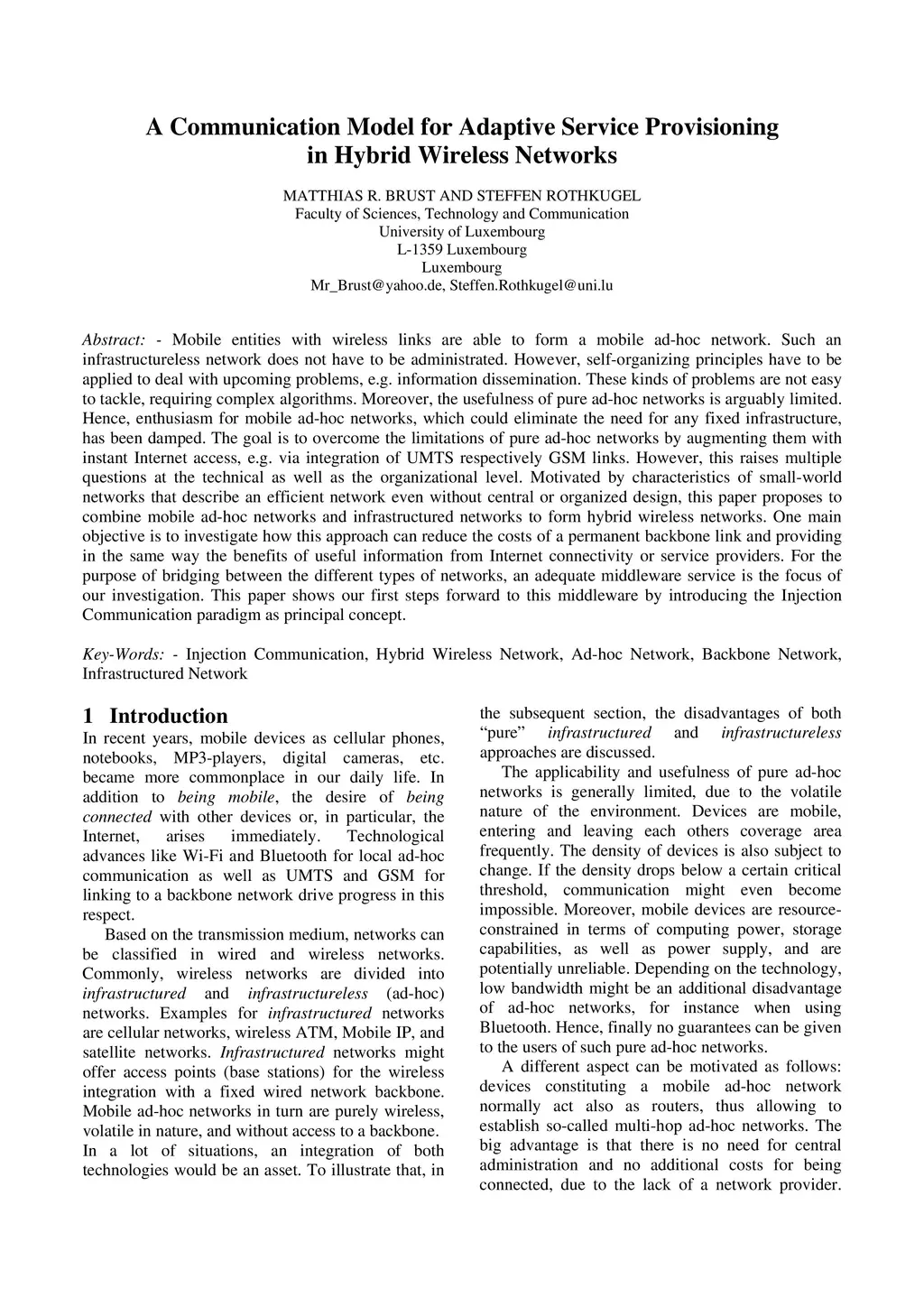Mobile entities with wireless links are able to form a mobile ad-hoc network. Such an infrastructureless network does not have to be administrated. However, self-organizing principles have to be applied to deal with upcoming problems, e.g. information dissemination. These kinds of problems are not easy to tackle, requiring complex algorithms. Moreover, the usefulness of pure ad-hoc networks is arguably limited. Hence, enthusiasm for mobile ad-hoc networks, which could eliminate the need for any fixed infrastructure, has been damped. The goal is to overcome the limitations of pure ad-hoc networks by augmenting them with instant Internet access, e.g. via integration of UMTS respectively GSM links. However, this raises multiple questions at the technical as well as the organizational level. Motivated by characteristics of small-world networks that describe an efficient network even without central or organized design, this paper proposes to combine mobile ad-hoc networks and infrastructured networks to form hybrid wireless networks. One main objective is to investigate how this approach can reduce the costs of a permanent backbone link and providing in the same way the benefits of useful information from Internet connectivity or service providers. For the purpose of bridging between the different types of networks, an adequate middleware service is the focus of our investigation. This paper shows our first steps forward to this middleware by introducing the Injection Communication paradigm as principal concept.