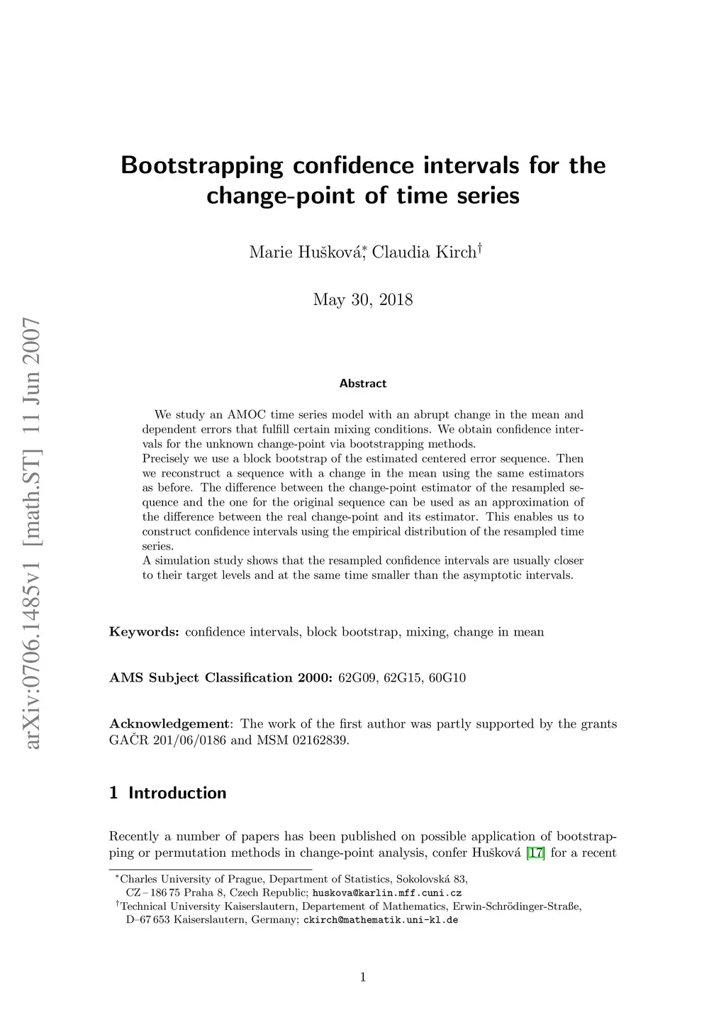 We study an AMOC time series model with an abrupt change in the mean and dependent errors that fulfill certain mixing conditions. We obtain confidence intervals for the unknown change-point via bootstrapping methods. Precisely we use a block bootstrap of the estimated centered error sequence. Then we reconstruct a sequence with a change in the mean using the same estimators as before. The difference between the change-point estimator of the resampled sequence and the one for the original sequence can be use as an approximation of the difference between the real change-point and its estimator. This enables us to construct confidence intervals using the empirical distribution of the resampled time series. A simulation study shows that the resampled confidence intervals are usually closer to their target levels and at the same time smaller than the asymptotic intervals.