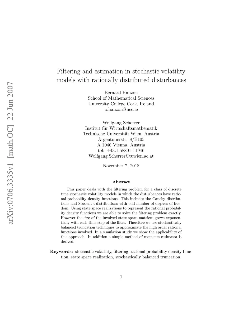 This paper deals with the filtering problem for a class of discrete time stochastic volatility models in which the disturbances have rational probability density functions. This includes the Cauchy distributions and Student t-distributions with odd number of degrees of freedom. Using state space realizations to represent the rational probability density functions we are able to solve the filtering problem exactly. However the size of the involved state space matrices grows exponentially with each time step of the filter. Therefore we use stochastically balanced truncation techniques to approximate the high order rational functions involved. In a simulation study we show the applicability of this approach. In addition a simple method of moments estimator is derived.