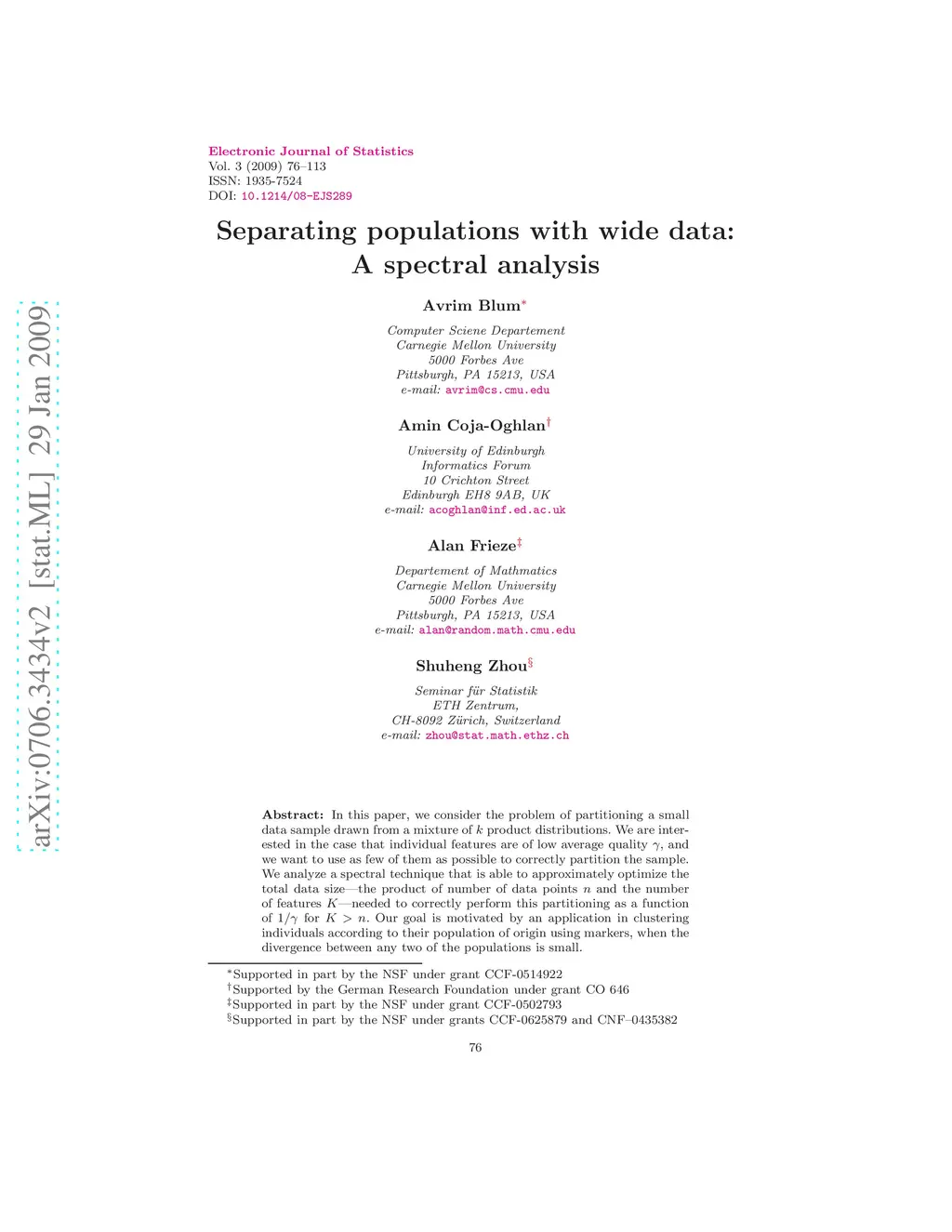 In this paper, we consider the problem of partitioning a small data sample drawn from a mixture of product distributions. We are interested in the case that individual features are of low average quality , and we want to use as few of them as possible to correctly partition the sample. We analyze a spectral technique that is able to approximately optimize the total data size--the product of number of data points and the number of features --needed to correctly perform this partitioning as a function of for . Our goal is motivated by an application in clustering individuals according to their population of origin using markers, when the divergence between any two of the populations is small.