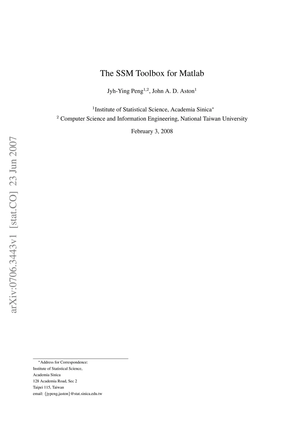 State Space Models (SSM) is a MATLAB 7.0 software toolbox for doing time series analysis by state space methods. The software features fully interactive construction and combination of models, with support for univariate and multivariate models, complex time-varying (dynamic) models, non-Gaussian models, and various standard models such as ARIMA and structural time-series models. The software includes standard functions for Kalman filtering and smoothing, simulation smoothing, likelihood evaluation, parameter estimation, signal extraction and forecasting, with incorporation of exact initialization for filters and smoothers, and support for missing observations and multiple time series input with common analysis structure. The software also includes implementations of TRAMO model selection and Hillmer-Tiao decomposition for ARIMA models. The software will provide a general toolbox for doing time series analysis on the MATLAB platform, allowing users to take advantage of its readily available graph plotting and general matrix computation capabilities.