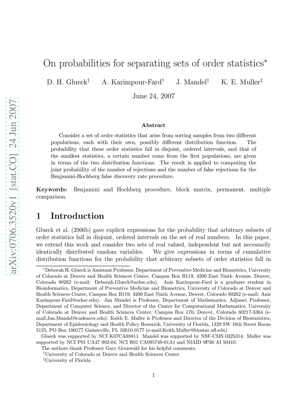Consider a set of order statistics that arise from sorting samples from two different populations, each with their own, possibly different distribution function. The probability that these order statistics fall in disjoint, ordered intervals, and that of the smallest statistics, a certain number come from the first populations, are given in terms of the two distribution functions. The result is applied to computing the joint probability of the number of rejections and the number of false rejections for the Benjamini-Hochberg false discovery rate procedure.
