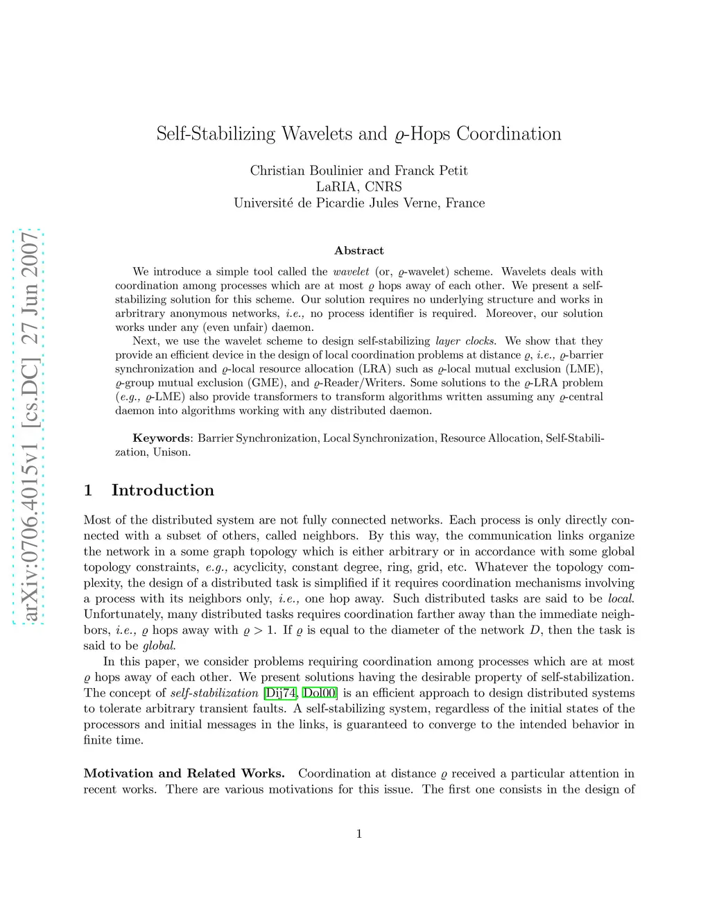 We introduce a simple tool called the wavelet (or, r-wavelet) scheme. Wavelets deals with coordination among processes which are at most r hops away of each other. We present a selfstabilizing solution for this scheme. Our solution requires no underlying structure and works in arbritrary anonymous networks, i.e., no process identifier is required. Moreover, our solution works under any (even unfair) daemon. Next, we use the wavelet scheme to design self-stabilizing layer clocks. We show that they provide an efficient device in the design of local coordination problems at distance r, i.e., r-barrier synchronization and r-local resource allocation (LRA) such as r-local mutual exclusion (LME), r-group mutual exclusion (GME), and r-Reader/Writers. Some solutions to the r-LRA problem (e.g., r-LME) also provide transformers to transform algorithms written assuming any r-central daemon into algorithms working with any distributed daemon.