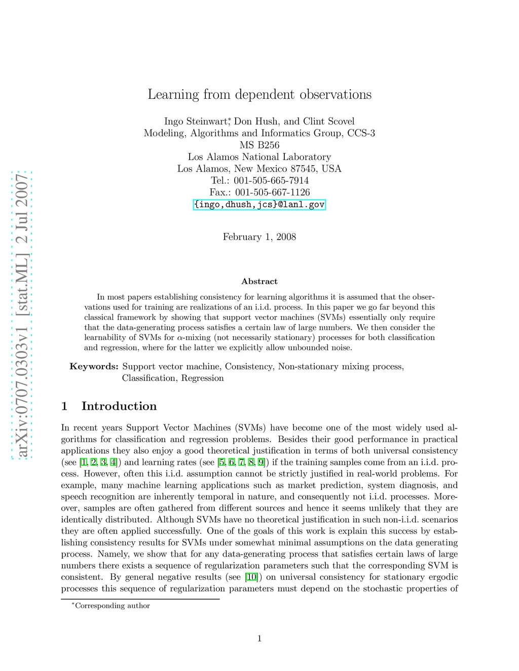 In most papers establishing consistency for learning algorithms it is assumed that the observations used for training are realizations of an i.i.d. process. In this paper we go far beyond this classical framework by showing that support vector machines (SVMs) essentially only require that the data-generating process satisfies a certain law of large numbers. We then consider the learnability of SVMs for -mixing (not necessarily stationary) processes for both classification and regression, where for the latter we explicitly allow unbounded noise.