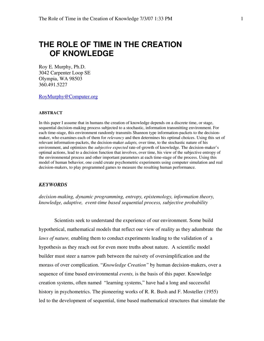 This paper I assume that in humans the creation of knowledge depends on a discrete time, or stage, sequential decision-making process subjected to a stochastic, information transmitting environment. For each time-stage, this environment randomly transmits Shannon type information-packets to the decision-maker, who examines each of them for relevancy and then determines his optimal choices. Using this set of relevant information-packets, the decision-maker adapts, over time, to the stochastic nature of his environment, and optimizes the subjective expected rate-of-growth of knowledge. The decision-maker's optimal actions, lead to a decision function that involves, over time, his view of the subjective entropy of the environmental process and other important parameters at each time-stage of the process. Using this model of human behavior, one could create psychometric experiments using computer simulation and real decision-makers, to play programmed games to measure the resulting human performance.