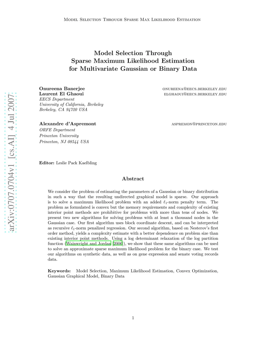 Model Selection Through Sparse Maximum Likelihood Estimation