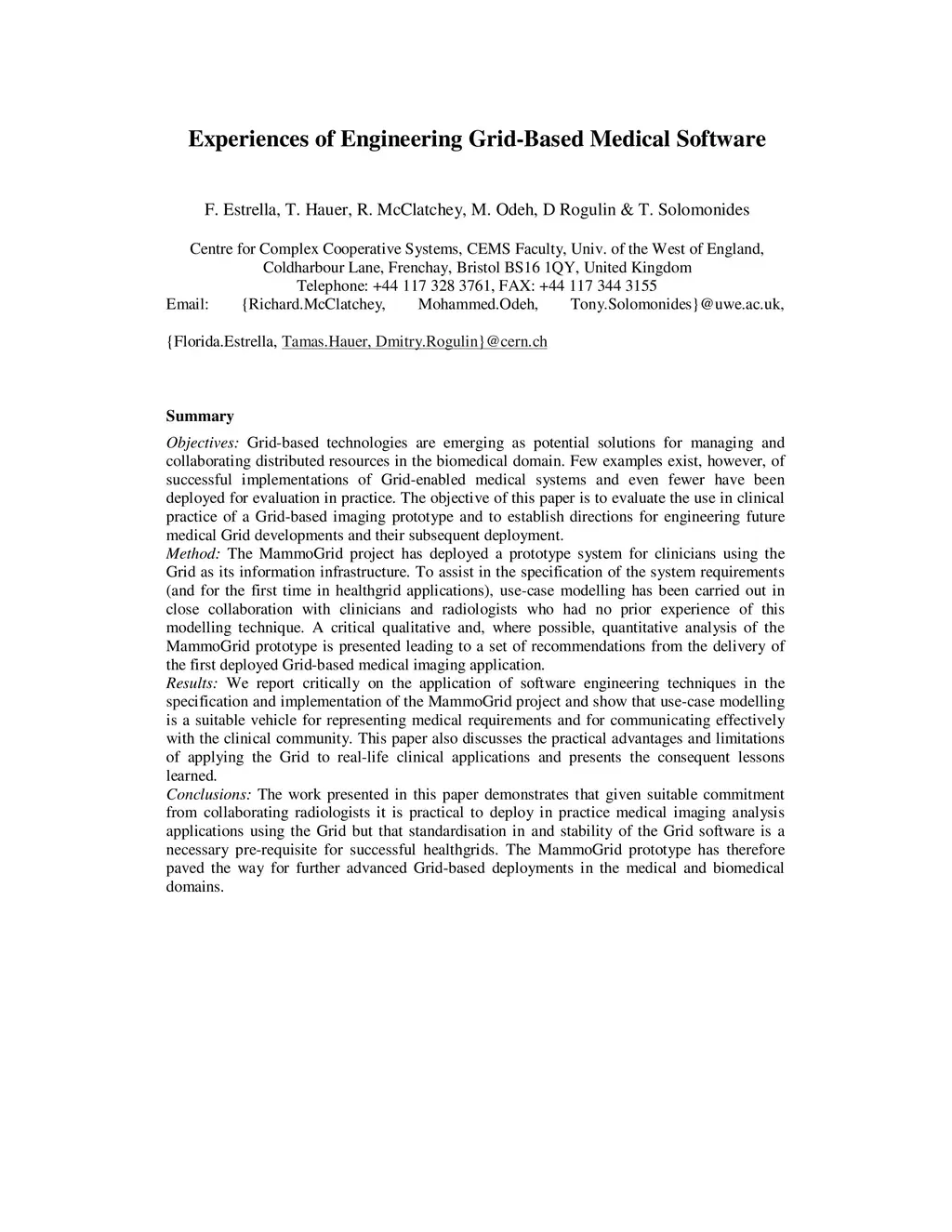 Objectives: Grid-based technologies are emerging as potential solutions for managing and collaborating distributed resources in the biomedical domain. Few examples exist, however, of successful implementations of Grid-enabled medical systems and even fewer have been deployed for evaluation in practice. The objective of this paper is to evaluate the use in clinical practice of a Grid-based imaging prototype and to establish directions for engineering future medical Grid developments and their subsequent deployment. Method: The MammoGrid project has deployed a prototype system for clinicians using the Grid as its information infrastructure. To assist in the specification of the system requirements (and for the first time in healthgrid applications), use-case modelling has been carried out in close collaboration with clinicians and radiologists who had no prior experience of this modelling technique. A critical qualitative and, where possible, quantitative analysis of the MammoGrid prototype is presented leading to a set of recommendations from the delivery of the first deployed Grid-based medical imaging application. Results: We report critically on the application of software engineering techniques in the specification and implementation of the MammoGrid project and show that use-case modelling is a suitable vehicle for representing medical requirements and for communicating effectively with the clinical community. This paper also discusses the practical advantages and limitations of applying the Grid to real-life clinical applications and presents the consequent lessons learned.