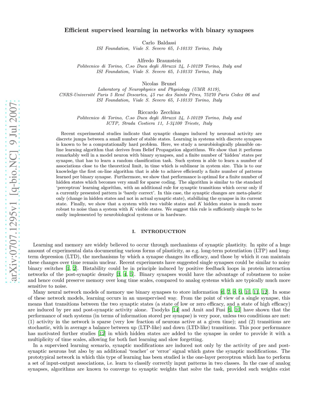 Recent experimental studies indicate that synaptic changes induced by neuronal activity are discrete jumps between a small number of stable states. Learning in systems with discrete synapses is known to be a computationally hard problem. Here, we study a neurobiologically plausible on-line learning algorithm that derives from Belief Propagation algorithms. We show that it performs remarkably well in a model neuron with binary synapses, and a finite number of `hidden' states per synapse, that has to learn a random classification task. Such system is able to learn a number of associations close to the theoretical limit, in time which is sublinear in system size. This is to our knowledge the first on-line algorithm that is able to achieve efficiently a finite number of patterns learned per binary synapse. Furthermore, we show that performance is optimal for a finite number of hidden states which becomes very small for sparse coding. The algorithm is similar to the standard `perceptron' learning algorithm, with an additional rule for synaptic transitions which occur only if a currently presented pattern is `barely correct'. In this case, the synaptic changes are meta-plastic only (change in hidden states and not in actual synaptic state), stabilizing the synapse in its current state. Finally, we show that a system with two visible states and K hidden states is much more robust to noise than a system with K visible states. We suggest this rule is sufficiently simple to be easily implemented by neurobiological systems or in hardware.