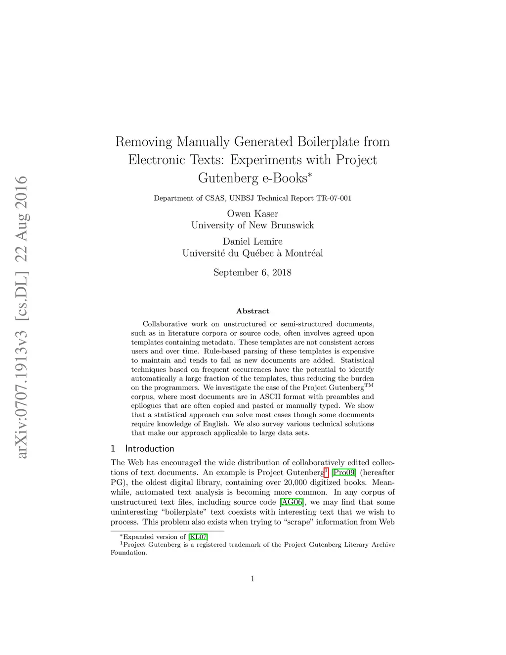 Collaborative work on unstructured or semi-structured documents, such as in literature corpora or source code, often involves agreed upon templates containing metadata. These templates are not consistent across users and over time. Rule-based parsing of these templates is expensive to maintain and tends to fail as new documents are added. Statistical techniques based on frequent occurrences have the potential to identify automatically a large fraction of the templates, thus reducing the burden on the programmers. We investigate the case of the Project Gutenberg corpus, where most documents are in ASCII format with preambles and epilogues that are often copied and pasted or manually typed. We show that a statistical approach can solve most cases though some documents require knowledge of English. We also survey various technical solutions that make our approach applicable to large data sets.