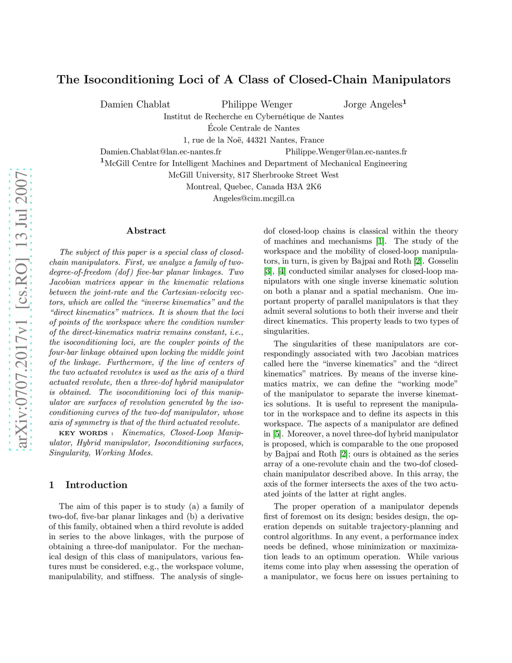 The subject of this paper is a special class of closed-chain manipulators. First, we analyze a family of two-degree-of-freedom (dof) five-bar planar linkages. Two Jacobian matrices appear in the kinematic relations between the joint-rate and the Cartesian-velocity vectors, which are called the ``inverse kinematics" and the "direct kinematics" matrices. It is shown that the loci of points of the workspace where the condition number of the direct-kinematics matrix remains constant, i.e., the isoconditioning loci, are the coupler points of the four-bar linkage obtained upon locking the middle joint of the linkage. Furthermore, if the line of centers of the two actuated revolutes is used as the axis of a third actuated revolute, then a three-dof hybrid manipulator is obtained. The isoconditioning loci of this manipulator are surfaces of revolution generated by the isoconditioning curves of the two-dof manipulator, whose axis of symmetry is that of the third actuated revolute.
