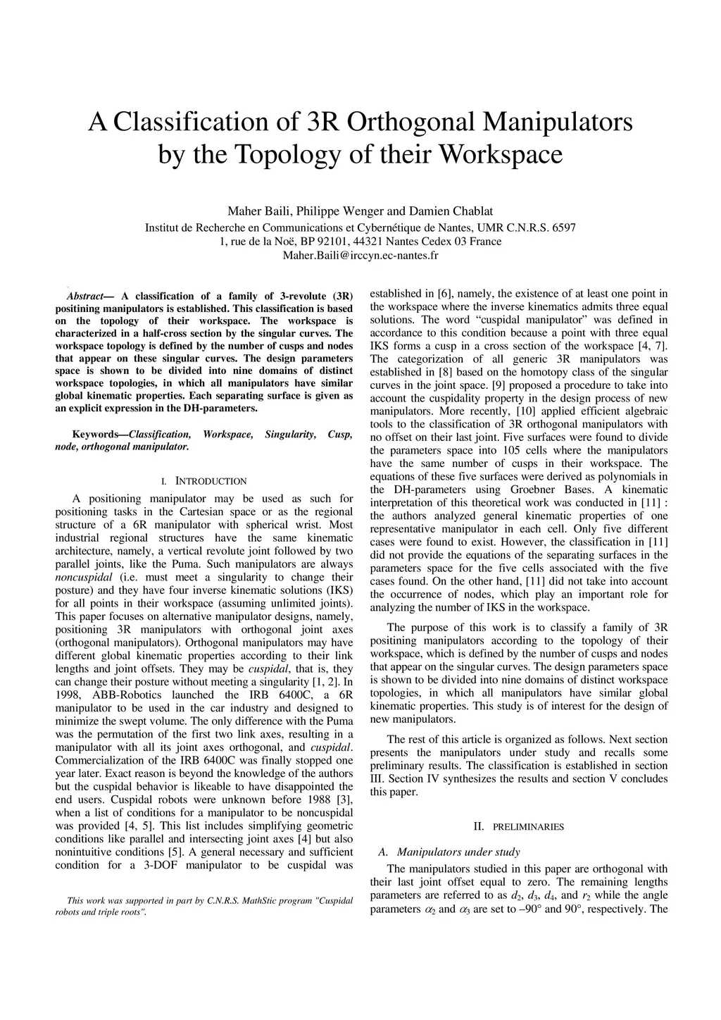 A classification of a family of 3-revolute (3R) positining manipulators is established. This classification is based on the topology of their workspace. The workspace is characterized in a half-cross section by the singular curves. The workspace topology is defined by the number of cusps and nodes that appear on these singular curves. The design parameters space is shown to be divided into nine domains of distinct workspace topologies, in which all manipulators have similar global kinematic properties. Each separating surface is given as an explicit expression in the DH-parameters.
