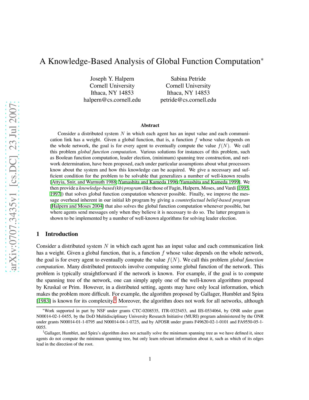 Consider a distributed system N in which each agent has an input value and each communication link has a weight. Given a global function, that is, a function f whose value depends on the whole network, the goal is for every agent to eventually compute the value f(N). We call this problem global function computation. Various solutions for instances of this problem, such as Boolean function computation, leader election, (minimum) spanning tree construction, and network determination, have been proposed, each under particular assumptions about what processors know about the system and how this knowledge can be acquired. We give a necessary and sufficient condition for the problem to be solvable that generalizes a number of well-known results. We then provide a knowledge-based (kb) program (like those of Fagin, Halpern, Moses, and Vardi) that solves global function computation whenever possible. Finally, we improve the message overhead inherent in our initial kb program by giving a counterfactual belief-based program that also solves the global function computation whenever possible, but where agents send messages only when they believe it is necessary to do so. The latter program is shown to be implemented by a number of well-known algorithms for solving leader election.