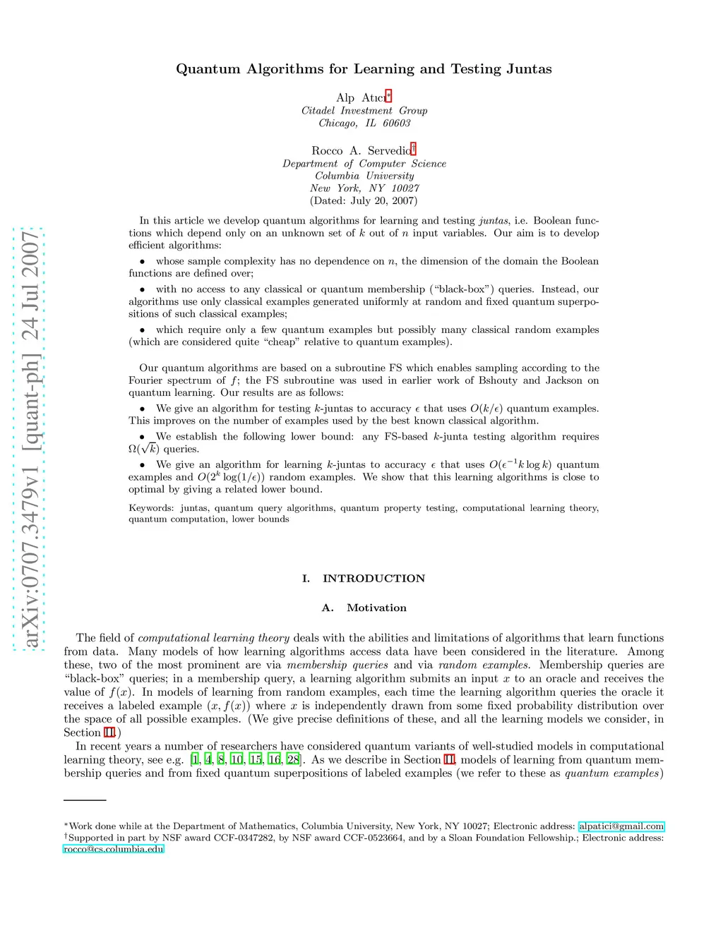 In this article we develop quantum algorithms for learning and testing juntas, i.e. Boolean functions which depend only on an unknown set of k out of n input variables. Our aim is to develop efficient algorithms: - whose sample complexity has no dependence on n, the dimension of the domain the Boolean functions are defined over; - with no access to any classical or quantum membership ("black-box") queries. Instead, our algorithms use only classical examples generated uniformly at random and fixed quantum superpositions of such classical examples; - which require only a few quantum examples but possibly many classical random examples (which are considered quite "cheap" relative to quantum examples). Our quantum algorithms are based on a subroutine FS which enables sampling according to the Fourier spectrum of f; the FS subroutine was used in earlier work of Bshouty and Jackson on quantum learning. Our results are as follows: - We give an algorithm for testing k-juntas to accuracy that uses quantum examples. This improves on the number of examples used by the best known classical algorithm. - We establish the following lower bound: any FS-based k-junta testing algorithm requires queries. - We give an algorithm for learning -juntas to accuracy that uses quantum examples and random examples. We show that this learning algorithms is close to optimal by giving a related lower bound.