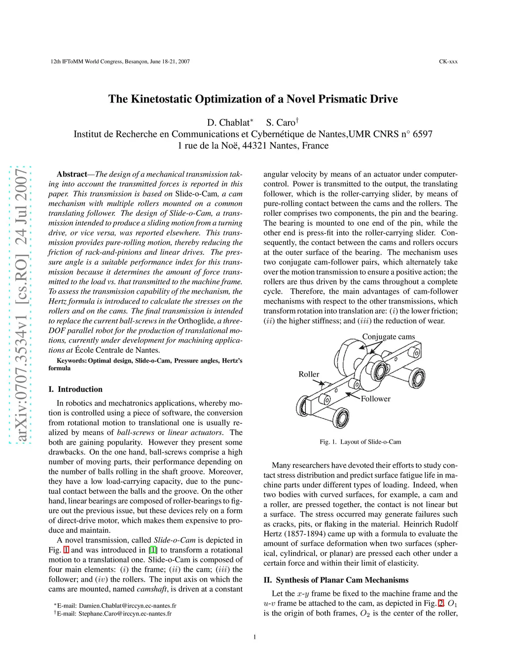 The design of a mechanical transmission taking into account the transmitted forces is reported in this paper. This transmission is based on Slide-o-Cam, a cam mechanism with multiple rollers mounted on a common translating follower. The design of Slide-o-Cam, a transmission intended to produce a sliding motion from a turning drive, or vice versa, was reported elsewhere. This transmission provides pure-rolling motion, thereby reducing the friction of rack-and-pinions and linear drives. The pressure angle is a suitable performance index for this transmission because it determines the amount of force transmitted to the load vs. that transmitted to the machine frame. To assess the transmission capability of the mechanism, the Hertz formula is introduced to calculate the stresses on the rollers and on the cams. The final transmission is intended to replace the current ball-screws in the Orthoglide, a three-DOF parallel robot for the production of translational motions, currently under development for machining applications at Ecole Centrale de Nantes.