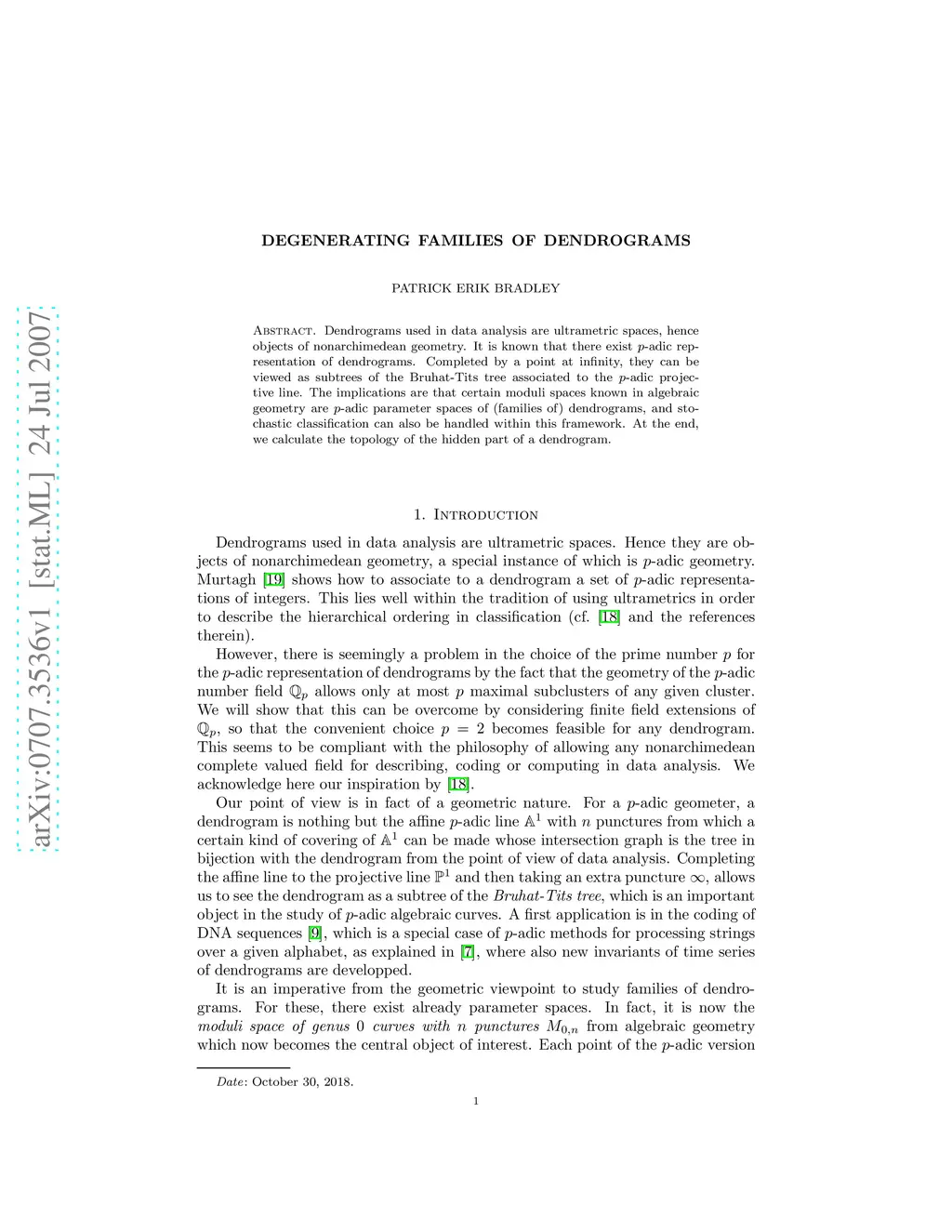 Dendrograms used in data analysis are ultrametric spaces, hence objects of nonarchimedean geometry. It is known that there exist -adic representation of dendrograms. Completed by a point at infinity, they can be viewed as subtrees of the Bruhat-Tits tree associated to the -adic projective line. The implications are that certain moduli spaces known in algebraic geometry are -adic parameter spaces of (families of) dendrograms, and stochastic classification can also be handled within this framework. At the end, we calculate the topology of the hidden part of a dendrogram.