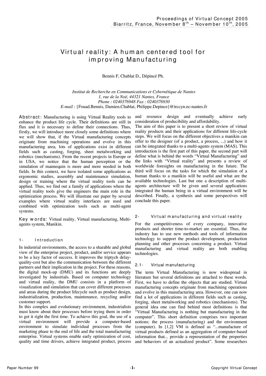 Manufacturing is using Virtual Reality tools to enhance the product life cycle. Their definitions are still in flux and it is necessary to define their connections. Thus, firstly, we will introduce more closely some definitions where we will find that, if the Virtual manufacturing concepts originate from machining operations and evolve in this manufacturing area, there exist a lot of applications in different fields such as casting, forging, sheet metalworking and robotics (mechanisms). From the recent projects in Europe or in USA, we notice that the human perception or the simulation of mannequin is more and more needed in both fields. In this context, we have isolated some applications as ergonomic studies, assembly and maintenance simulation, design or training where the virtual reality tools can be applied. Thus, we find out a family of applications where the virtual reality tools give the engineers the main role in the optimization process. We will illustrate our paper by several examples where virtual reality interfaces are used and combined with optimization tools as multi-agent systems.