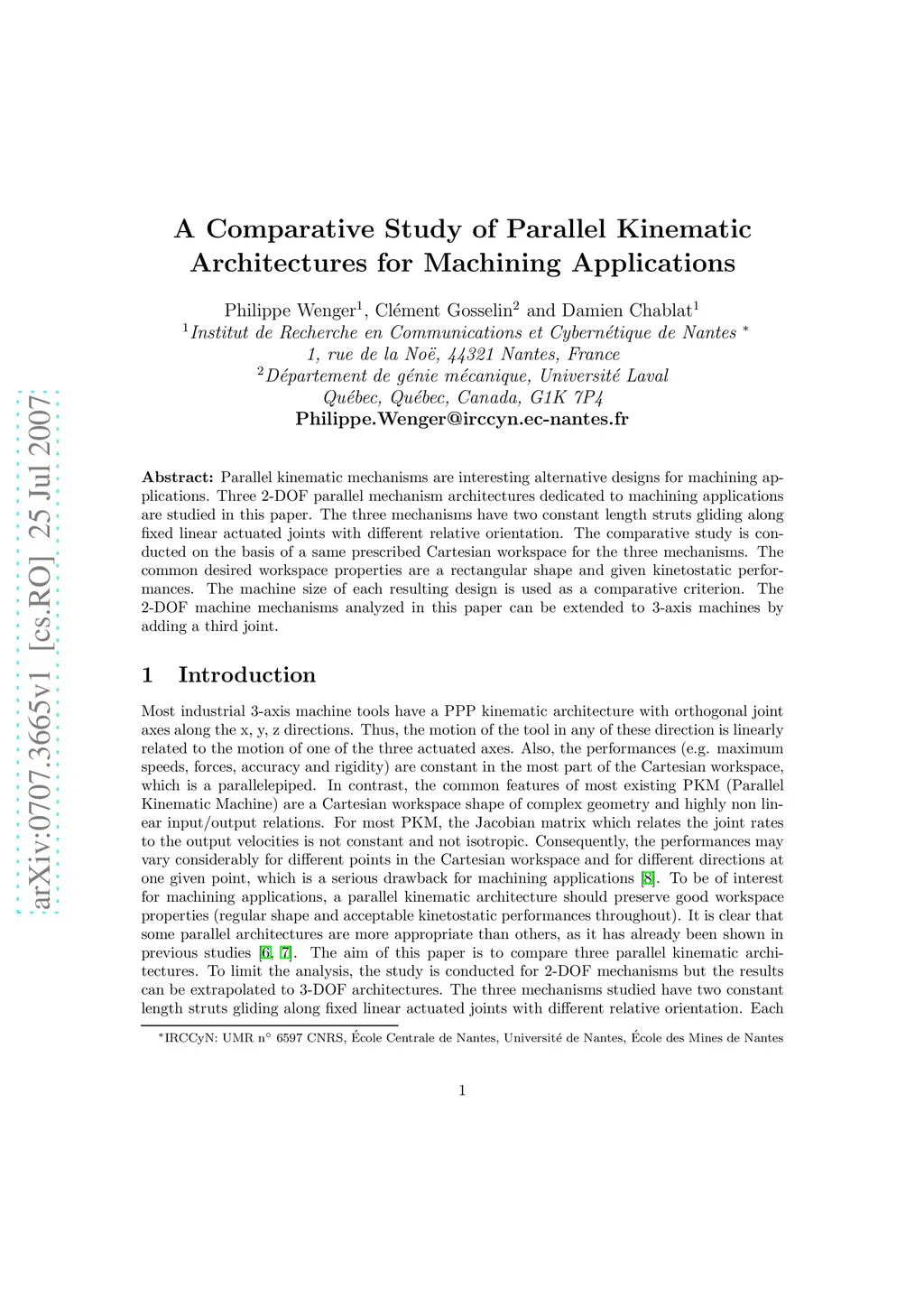 Parallel kinematic mechanisms are interesting alternative designs for machining applications. Three 2-DOF parallel mechanism architectures dedicated to machining applications are studied in this paper. The three mechanisms have two constant length struts gliding along fixed linear actuated joints with different relative orientation. The comparative study is conducted on the basis of a same prescribed Cartesian workspace for the three mechanisms. The common desired workspace properties are a rectangular shape and given kinetostatic performances. The machine size of each resulting design is used as a comparative criterion. The 2-DOF machine mechanisms analyzed in this paper can be extended to 3-axis machines by adding a third joint.