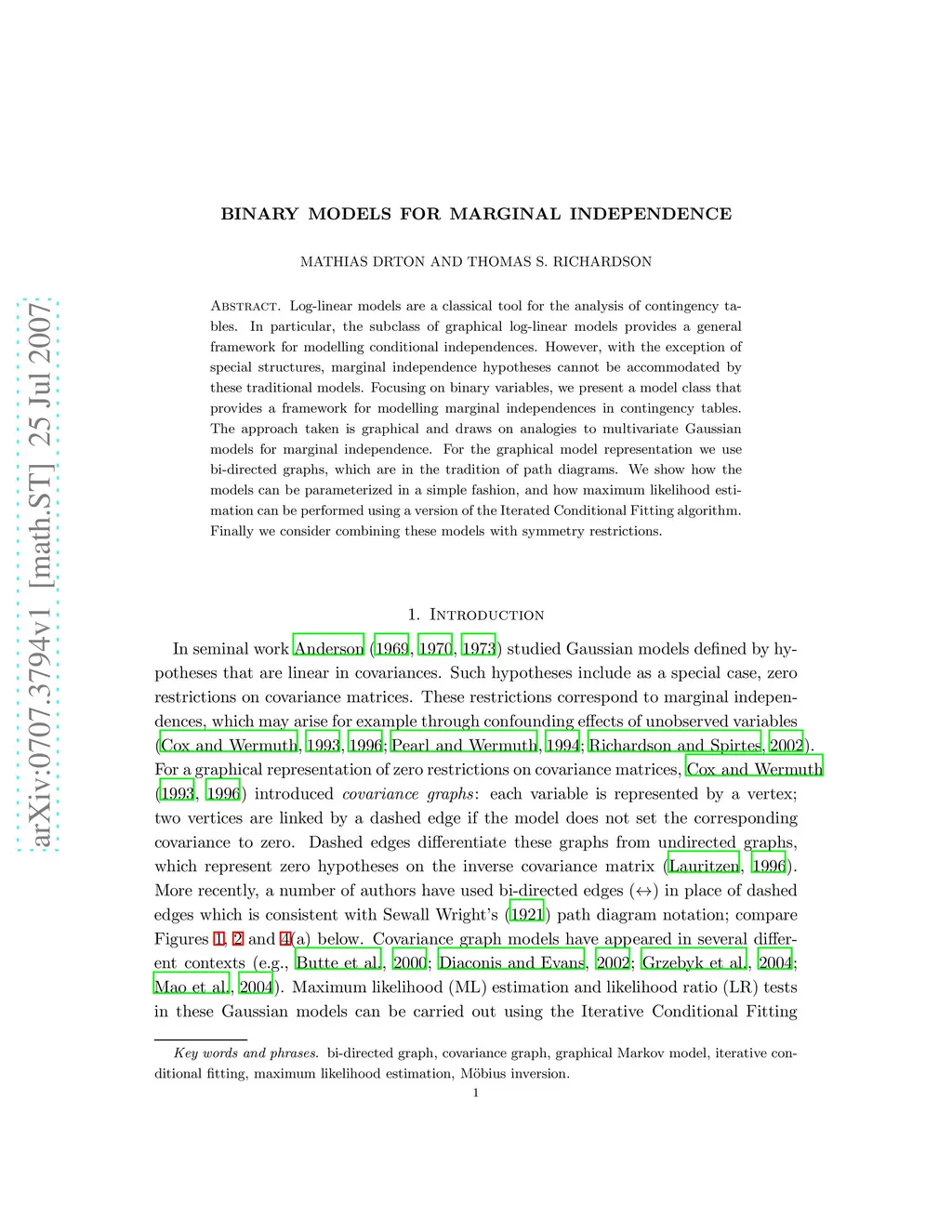 Binary Models for Marginal Independence